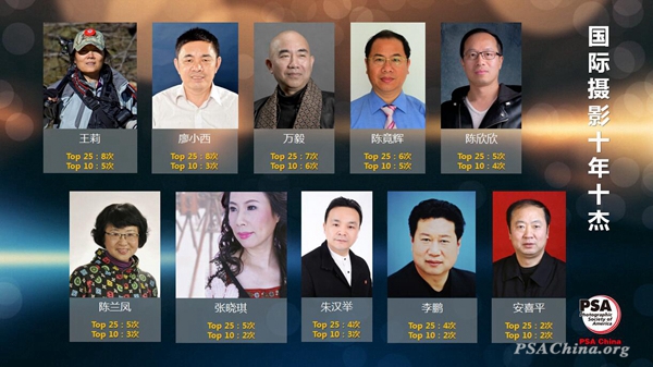 ![]() 在PSA China十周年纪念之际,PSAChina再次评选出PSA China十年国际摄影十杰。这是依据在过去十年间,入围PSA China国际摄影积分前25名以及PSA China国际摄影十杰的次数,评选而出的。