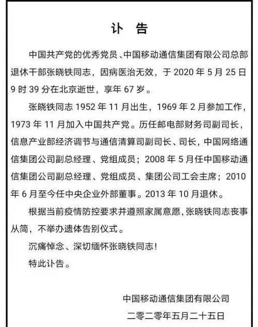 深切悼念PSA China资深会员 中国移动通信原副总经理张晓铁同志时间:2020年5月28日 据《人民邮电报》报道,中国共产党党员、中国移动通信集团有限公司总部退休干部张晓铁同志,因病医治无效,于2020年5月25日9时39分在北京逝世,享年67岁。 张晓铁同志热爱摄影,作为PSA China与PSA资深会员,多年来关心和关注PSA China的发展,积极参加PSA China的各类活动,曾受邀担任“第二届PSA China国际摄影展”开幕剪彩嘉宾,出席Photoshop CS5从基础到提高系列专题讲座以及各种PSA China会员活动,是众多PSA China会员以及摄影爱好者敬重的老朋友,我们为失去这样一位老友而感到悲痛不以。 转中国移动通信集团有限公司讣告 沉痛哀悼,深切缅怀,一路走好~