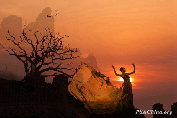 张红梅画意彩色组不限主题作品:《夕阳丽影》The setting sun Raider
