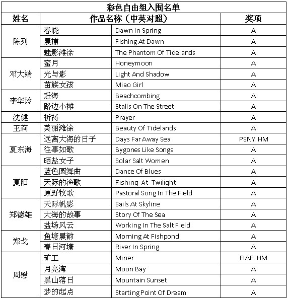 纽约摄影学会2011年第39届国际沙龙摄影展由美国摄影学会认证,设立彩色自由组和彩色风光组两个组别。所有入选作品将列入美国摄影学会(PSA)星标系统。 以下为入围获奖名单: 除了上述会员通过PSA China送展的作品入围获奖外,还有一些其他的PSA中国会员和摄影人的作品入围,会员莫志刚先生的《流水似金》(Running Water)获得彩色自由组PSNY绶带奖,《一弯的色泽》(Color)、《夕阳下的牧场》(The Farm under the Sunset)获得彩色风光组入围。会员普通先生的《梯田》(Gin Terrace)获得彩色自由组入围,《草原早晨》(Prairie Morning),《余辉映湖》(Afterglow Lake)和《无限美丽》(Infinite Beauty)获得彩色风光组入围。龚志兵先生的《尼玛男孩》(Nima Boy)获得彩色自由组入围。吴泽龄先生的《梳妆》(Dressing)获得彩色自由组入围。 在此,美国摄影学会(中国)向所有在本届影展中获得优异成绩的中国参展者表示衷心的祝贺! |