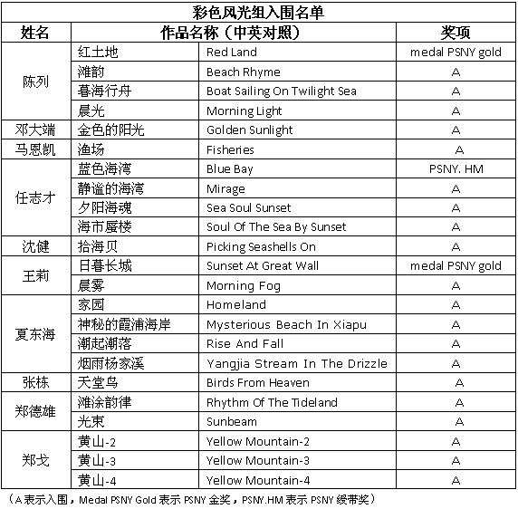 2011年纽约摄影学会第39届国际沙龙摄影展获奖成绩公布时间:2011年8月16日 来源:本站原创 2011年纽约摄影学会第39届国际沙龙摄影展览(39th PSNY INTERNATIONAL SALON OF COLOR PHOTOGRAPHY 2011)获奖成绩近日公布。在本届摄影展中,美国摄影学会(中国)共送展14位作者的92幅作品,获得入围以上作品48幅。其中,美国摄影学会会员王莉女士的《日暮长城》(Sunset At Great Wall)荣获彩色风光组PSNY金奖,会员陈列先生的作品《红土地》(Red Land)荣获彩色风光组PSNY金奖,会员任志才先生的《蓝色海湾》(Blue Bay)荣获彩色风光组PSNY绶带奖,会员夏东海先生的作品《远离大海的日子》(Days Far Away Sea)荣获彩色自由组PSNY绶带奖,会员周慰女士的作品《矿工》(Miner)荣获彩色自由组FIAP绶带奖。