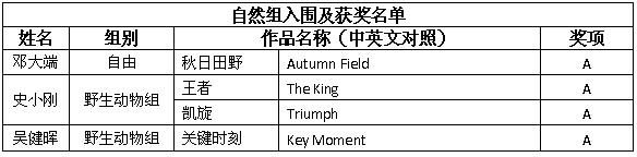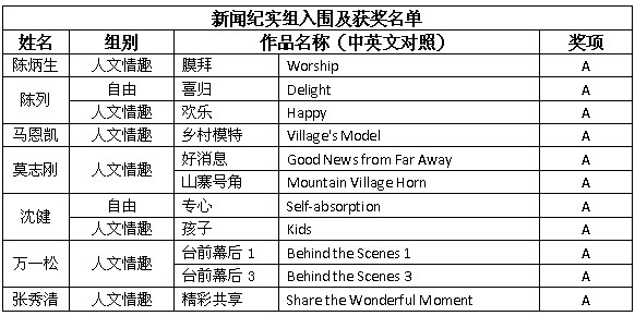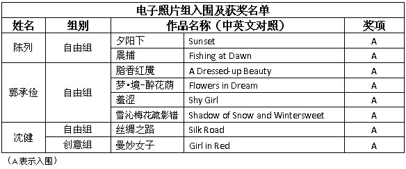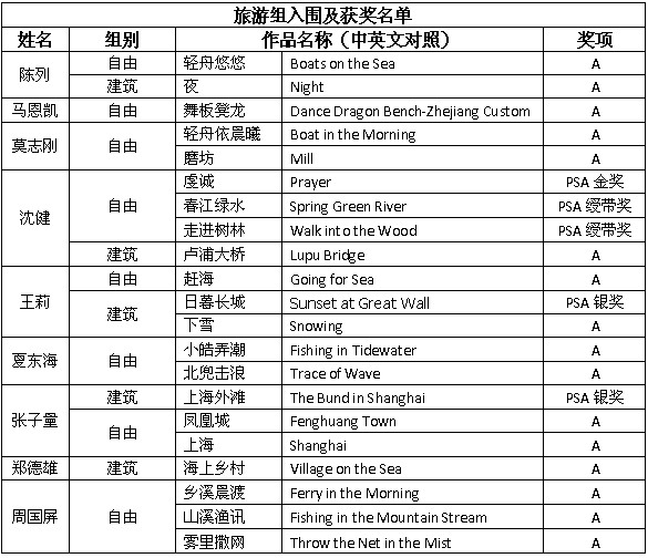 2011 美国摄影学会国际摄影展共设立彩色投影照片组(彩色自由组和黑白自由组)、旅游照片组(自由组和建筑组)、自然组(自由组和野生生物组)、新闻纪实组(自由组和人文情趣组),电子照片组(自由组和创意组),3D照片组(自由组和创意组)六个组别。所有入选作品将列入美国摄影学会(PSA)星标系统。 以下为入围获奖名单: 除了上述会员通过PSA China送展的作品入围获奖外,还有一些其他的PSA中国会员和摄影人的作品入围,会员卢志农先生的《晨作》(The Morning Works)荣获旅游照片自由组PSA银奖,《动感之都》(Jerking Motion)获得旅游照片建筑组入围,《快乐的击鼓》(Happy Drum)获得新闻纪实自由组入围,《愉快的私语》(Happy Chatting)、《葡萄丰收》(Grapes Harvest)和《阶梯》(Ladder)获得新闻纪实人文情趣组入围。会员高艳东先生的《树林》(The Woods)荣获旅游照片自由组PSA铜奖,《晨渔》(The Morning Fishing)获得旅游照片自由组入围。会员廖小西先生的《好奇》(Curiousness)、《下山》(Go Downhill)、《快乐的人们》(Happy Men)和《老妇人》(Old Lady)获得电子照片自由组入围,《回家》(Go Home)、《和谐社会》(Harmonious World)获得旅游照片自由组入围。会员许新亚先生的《故事》(Oh the Story)和《看见你的脸》(Tingting Yuli Show Your Face)获得电子照片创意组入围。吴亮先生的《仙境》(Fairyland)荣获旅游照片自由组PSA绶带奖,《烟火》(Fireworks)获得旅游照片自由组入围。 在此,美国摄影学会(中国)向所有在本届影展中获得优异成绩的中国参展者表示衷心的祝贺! 彩色投影照片组和3D照片组成绩待揭晓后会更新至本文,请继续关注PSA China官网。 张子量先生2011 美国摄影学会国际摄影展旅游建筑组PSA银奖作品《上海外滩》