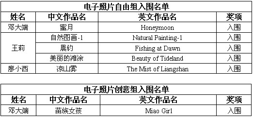 第五届克罗地亚国际数码摄影沙龙(International Projected Image Exhibition 2011)获奖成绩近日公布。在本届摄影展中,有多位美国摄影学会会员的优秀作品获得入围,入围作品名单如下: