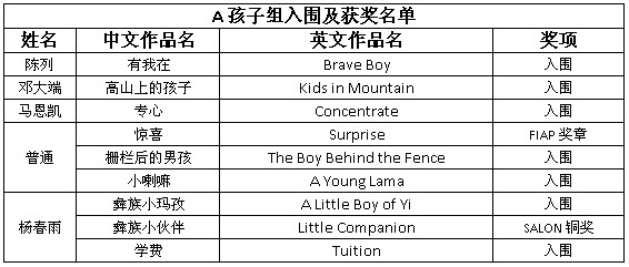 塞尔维亚“Child 2011”第35届摄影展(35th Exhibition Of Photographs Child 2011 )获奖成绩近日公布。在本届摄影展中,通过美国摄影学会(中国)送展获得入围以上奖项作品占比达到37%以上。美国摄影学会(PSA)会员杨春雨先生的《彝族小伙伴》(Little Companion)荣获孩子组SALON铜奖,会员普通先生的《惊喜》(Surprise)荣获孩子组FIAP奖章。