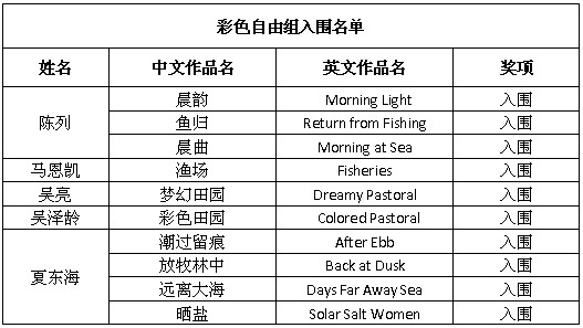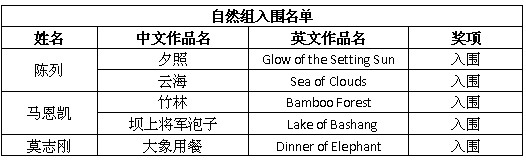 除了上述会员通过PSA China送展的作品入围获奖外,还有其他一些PSA中国会员的作品入围,会员廖小西先生的《祖母》(Grandmother)和《年轮》(Years)获得黑白自由组入围,《和谐世界》(Harmonious World)、《丰收》(Harvest)、《问候》(Greeting)和《视野》(Sight)获得彩色自由组入围,《回家》(Go Home)、《非洲晨曦》(Dawn in Africa)、《落日》(The Setting Sun)和《夕照》(Sunset Glow)获得自然组入围。