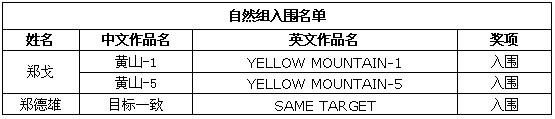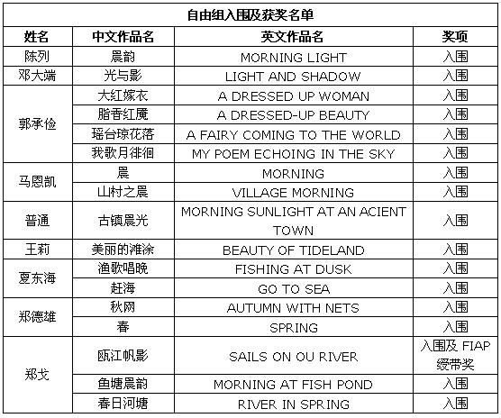 郑戈加拿大阿尔伯塔2011第一届国际数码摄影展自由组FIAP绶带奖作品《瓯江帆影》 加拿大阿尔伯塔2011第一届国际数码摄影展由美国摄影学会(PSA)认证,设立自由组和自然组两个组别。所有入选作品将列入美国摄影学会(PSA)星标系统。 以下为入围获奖名单: 除了上述会员通过PSA China送展的作品入围获奖外,还有其他一些PSA中国会员的作品入围,会员许新亚先生的《美丽的自然》(WOW-GOOD BEAUTY OF NATURE)和《优雅》(GRACEFUL)获得自由组入围。 在此,美国摄影学会(中国)(PSA China)向所有在本届影展中获得优异成绩的中国参展者表示衷心的祝贺! 部分入围作品欣赏: 陈列加拿大阿尔伯塔2011第一届国际数码摄影展参赛自由组入围作品《晨韵》 郭承俭加拿大阿尔伯塔2011第一届国际数码摄影展参赛自由组入围作品《大红嫁衣》 马恩凯加拿大阿尔伯塔2011第一届国际数码摄影展参赛自由组入围作品《山村之晨》 普通加拿大阿尔伯塔2011第一届国际数码摄影展参赛自由组入围作品《古镇晨光》 夏东海加拿大阿尔伯塔2011第一届国际数码摄影展参赛自由组入围作品《渔歌唱晚》 郑德雄加拿大阿尔伯塔2011第一届国际数码摄影展参赛自然组入围作品《目标一致》 |