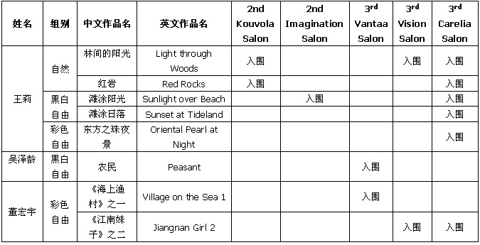 2011第3届芬兰国际数码巡回展获奖成绩公布时间:2011年10月19日 来源:本站原创 2011第3届芬兰国际数码巡回展(3rd Finland International Digital Circuit 2011)获奖成绩近日揭晓。本次巡回展3人8幅作品获得13次入围。其中,美国摄影学会会员王莉女士战绩颇丰,其作品(Light through Woods)《林间的阳光》(译)获得自然组三次入围。 2011第3届芬兰国际数码巡回展由美国摄影学会(PSA)认证,设立黑白自由组、彩色自由组和自然组,共三个组别。所有入选作品将列入美国摄影学会(PSA)星标系统。