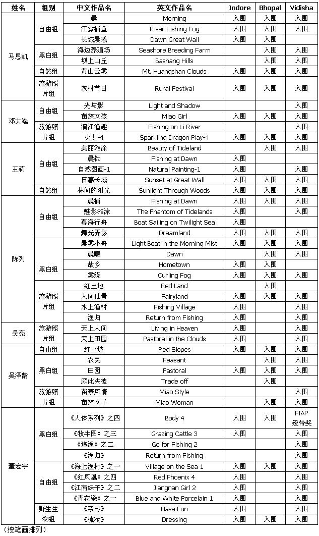 印度第8届Photolovers国际幻灯和数码摄影巡回展获奖成绩公布时间:2011年10月27日 来源:本站原创 2011印度第8届Photolovers国际幻灯和数码摄影巡回展(8th Photolovers International Digital Circuit 2011)获奖成绩近日揭晓。由美国摄影学会(中国)代投送展的会员作品取得了骄人的成绩!在本次巡回展中,我们7位会员的46幅作品获得高达101次的入围,可谓战绩颇丰。其中,美国摄影学会会员董宏宇先生的作品(BODY 4)《人体系列》之四在巡回展中获得黑白组两次入围,并荣获FIAP 绶带奖。多位会员作品获得三次入围。 2011印度第8届Photolovers国际幻灯和数码摄影巡回展由美国摄影学会(PSA),国际影艺联盟(FIAP)和英国皇家摄影学会(RPS)认证。设立自由组(CPID)、黑白组(CPID)、自然组(ND)、野生生物组(ND)和旅游照片组(PTD),共五个组别。所有入选作品将列入美国摄影学会(PSA)星标系统。 以下为入围及获奖名单: 除了上述会员通过PSA China送展的作品入围外,还有其他一些PSA中国会员的作品入围,其中会员卢志农先生的作品多次入围。其自由组作品(CATCH THE SEA)《博海》(译)分别在Indore、Bhopal、Vidisha中入围;黑白组作品(BUILD TALL BUILDINGS)《筑建》(译)在Bhopal入围,(FISHERMAN)《渔夫》(译)在Indore入围,(FISHING)《垂钓》(译)和(FERRY)《摆渡》(译)分别在Indore、Bhopal、Vidisha中入围;旅游照片组作品(RUNYANG BRIDGE)《润扬桥》(译)分别在Indore、Bhopal、Vidisha中入围。另外,会员耿洪杰的自由组作品(ANOTHER AMOROUS FEELINGS)《别有风情》分别在Indore、Vidisha中入围,(BEAUTIFUL MUSICAL NOTE)《美丽音符》分别在Indore、Bhopal、Vidisha中入围。 在此,美国摄影学会(中国)(PSA China)向所有在本届影展中获得优异成绩的中国参展者表示衷心的祝贺! |