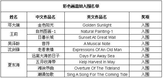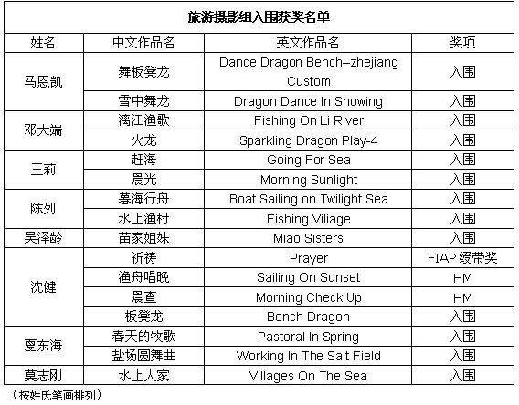 以下为入围获奖名单: 除了上述会员通过PSA China送展的作品入围获奖外,还有其他一些PSA中国会员的作品入围,会员廖小西先生的《乡村球赛》(Ball Game In Village)荣获彩色自由组FIAP绶带奖,《微笑》(Smile)获得彩色自由组入围,《辉煌的黄昏》(Glorious Dusk)获得自然组入围,《鸽子》(Dove)和《童年》(Childhood)获得旅游摄影组入围。会员程兴华先生的《马背上的牧民》(Horseback Herdsmen)获得旅游摄影组入围。 在此,美国摄影学会(中国)(PSA China)向所有在本届影展中获得优异成绩的中国参展者表示衷心的祝贺!