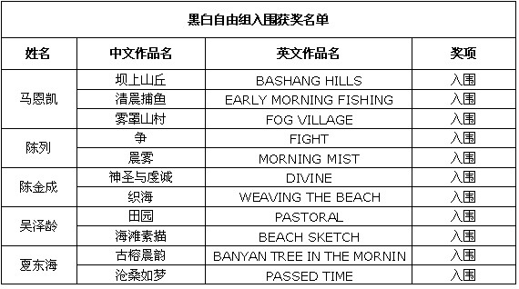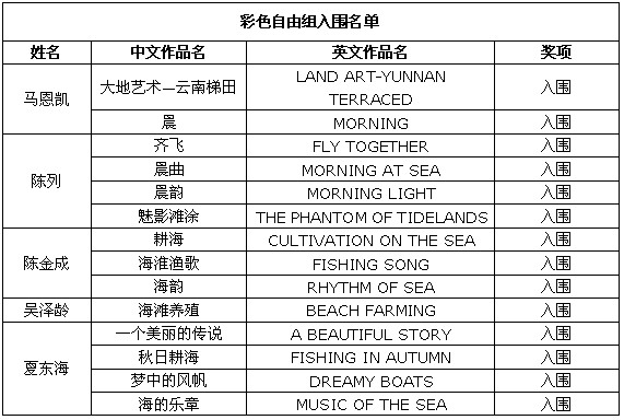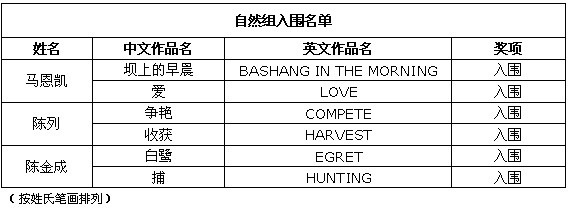 印度第一届WIDEANGLE国际摄影沙龙由美国摄影学会(PSA)认证,设立黑白自由组、彩色自由组和自然组,共3个组别。所有入选作品将列入美国摄影学会(PSA)星标系统。 以下为入围名单: 除了上述会员通过PSA China送展的作品入围获奖外,还有其他一些PSA中国会员的作品入围,会员程兴华女士的《季节》SEASONIC,会员肖戈先生的《愤怒的白犀牛》ANGRY WHITE RHINO和《角斗》 WRESTLING,以及会员许新亚先生的《渔事》FISHING WORK和《岛国》ISLAND TOWN获得黑白自由组入围。会员程兴华女士的《转变》TRANSITIONS,会员肖戈先生的MARCEL YOUNG,CROSS THE RIVER,ENTRANCE TO THE MASAI VILLAGE获得彩色自由组入围。会员肖戈先生的JUNIOR PARTNER,LARGE FORCE,会员许新亚先生的BEANS NIANG,获得自然组入围。 在此,美国摄影学会(中国)(PSA China)向所有在本届影展中获得优异成绩的中国参展者表示衷心的祝贺! |