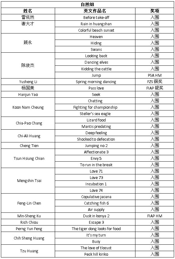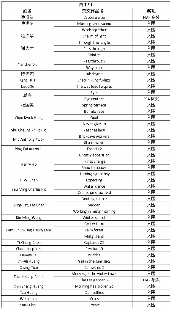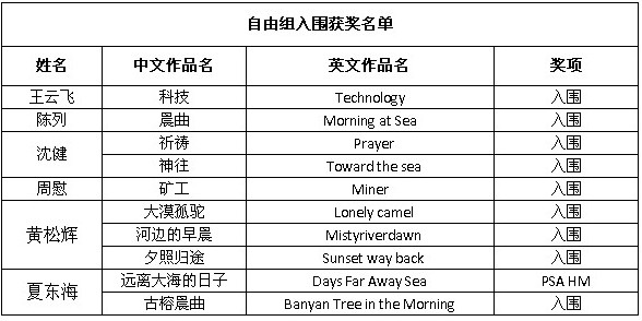 除了上述会员通过PSA China送展的作品入围获奖外,还有其他一些PSA中国会员和摄影朋友取得了不错的成绩,他们的获奖和入围作品如下: 在此,美国摄影学会(中国)(PSA China)向所有在本届影展中获得优异成绩的中国参展者表示衷心的祝贺!