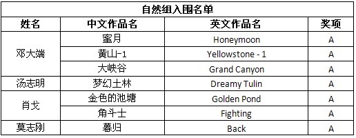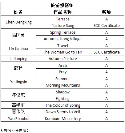 除了上述会员通过PSA China送展的作品入围获奖外,还有其他一些PSA中国会员和摄影朋友取得了不错的成绩,他们的获奖和入围作品如下: 在此,美国摄影学会(中国)(PSA China)向所有在本届影展中获得优异成绩的中国参展者表示衷心的祝贺!