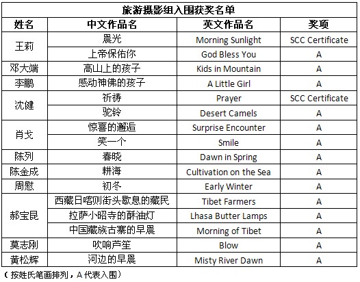 第99届英国南安普敦国际摄影展获奖成绩公布时间:2012年3月8日 来源:本站原创 第99届英国南安普敦国际摄影展(The 99th Southampton International Exhibition of Photography)近日公布结果,通过美国摄影学会(中国)代投、获得入围以上奖项的作品37幅。其中,美国摄影学会(PSA)会员王莉女士的《晨光》(Morning Sunlight)和会员沈健先生的《祈祷》(Prayer)都荣获了旅游摄影组SCC Certificate证书奖。在此,向两位会员表示祝贺! 以下为入围获奖名单: 第99届英国南安普敦国际摄影展由美国摄影学会(PSA)、欧洲国际影艺联盟(FIAP)和英国皇家摄影学会(RPS)认证,设立自由组、自然组和旅游摄影组三个组别。所有入选作品将列入美国摄影学会(PSA)星标系统。以下为获奖作品及部分入围作品: