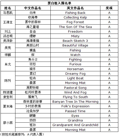 第9届美国佛罗里达州国际摄影展获奖成绩公布时间:2012年3月21日 来源:本站原创 第9届美国佛罗里达州国际摄影展(9th Tropical Image International Exhibition 2012)近日公布结果,通过美国摄影学会(中国)(PSA China)代投,获得入围以上奖项的作品达49幅。 以下为入围名单: 第9届美国佛罗里达州国际摄影展由美国摄影学会(PSA)认证,设立自由组、创意组和黑白组三个组别。所有入选作品将列入美国摄影学会(PSA)星标系统。以下为部分入围作品: 王清生自由组入围作品《银海天光》