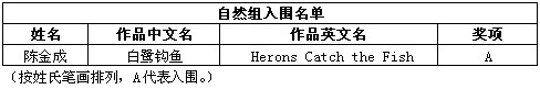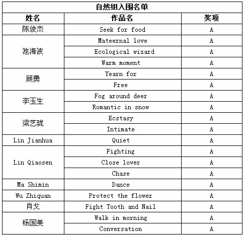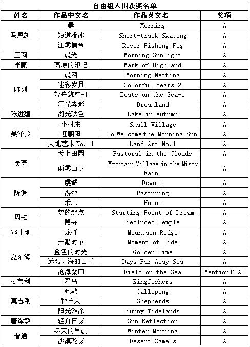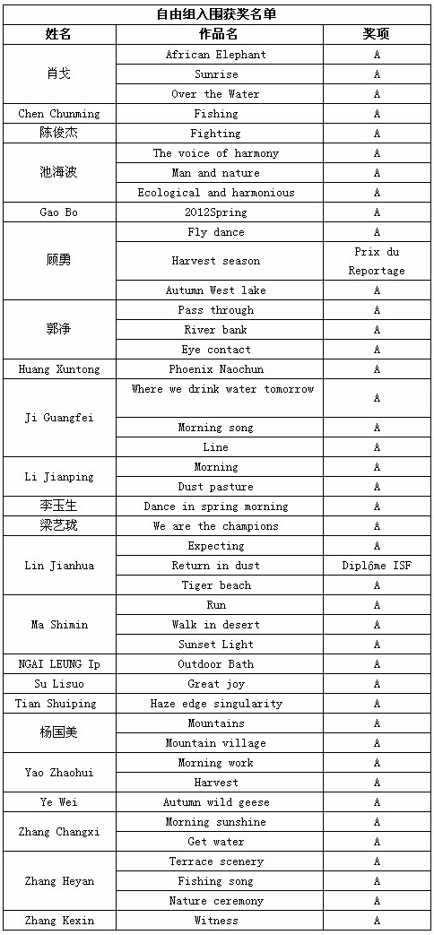 除了上述会员通过PSA China送展的作品入围获奖外,还有其他一些PSA中国会员和摄影朋友取得了不错的成绩,他们的获奖和入围作品如下: (排序不分先后,A代表入围) 在此,美国摄影学会(中国)(PSA China)向所有在本届影展中获得优异成绩的中国参展者表示衷心的祝贺!