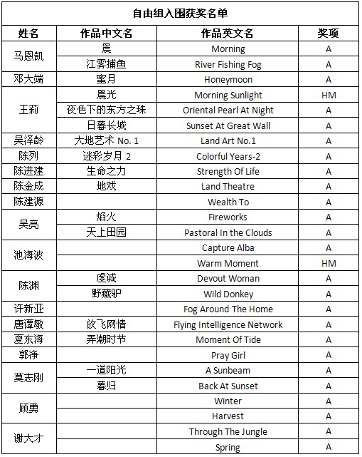 还有其他一些PSA中国会员和摄影朋友取得了不错的成绩,他们的获奖和入围作品如下: 在此,美国摄影学会(中国)(PSA China)向所有在本届影展中获得优异成绩的中国参展者表示衷心的祝贺!