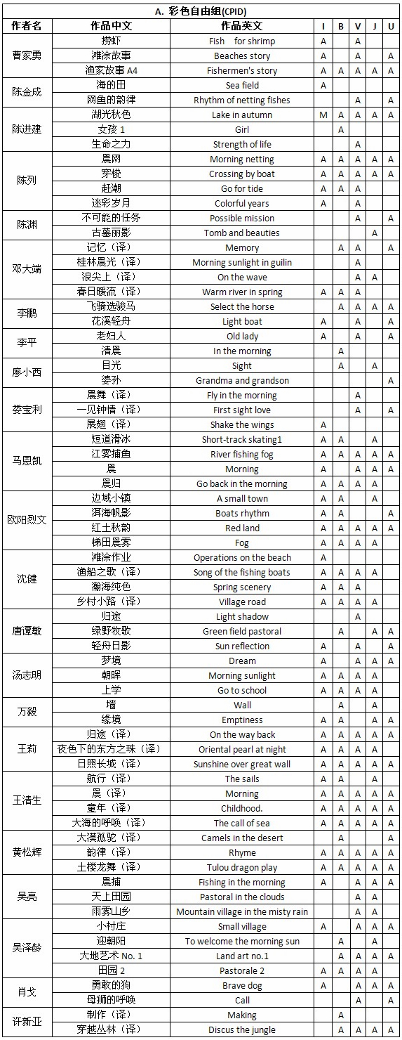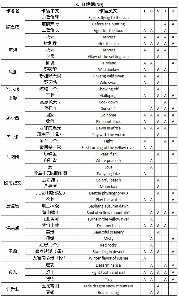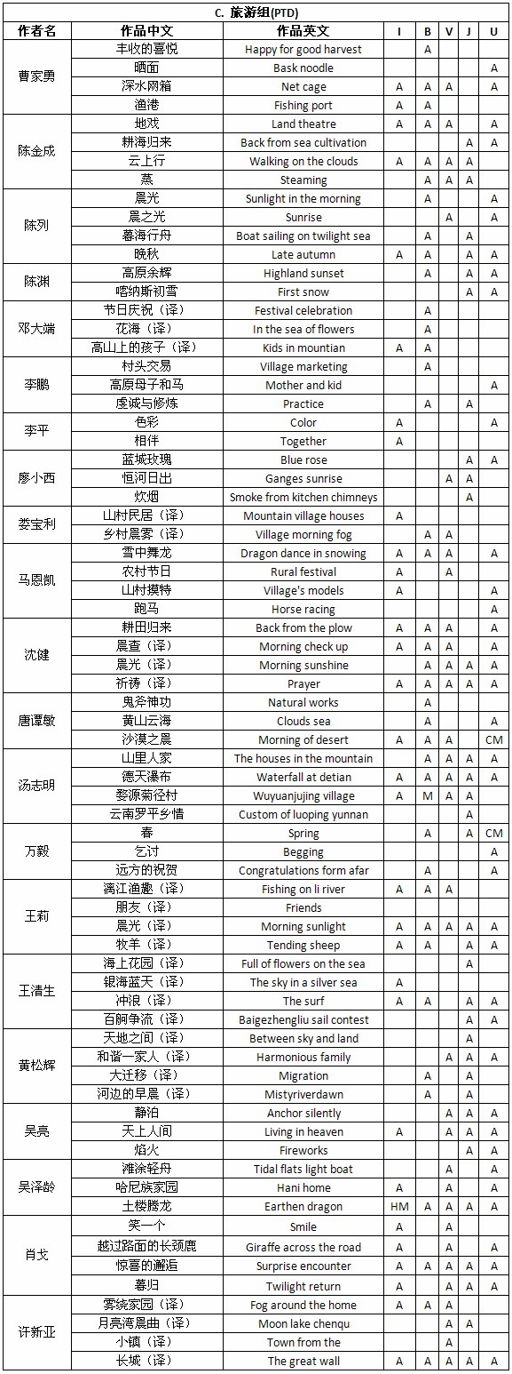2012年印度Grand数码摄影巡回展获奖成绩公布时间:2012年6月15日 来源:本站原创 2012年印度Grand数码摄影巡回展(GRAND DIGITAL CIRCUIT, 2012)近日公布结果,美国摄影学会(中国)(PSA China)会员23人获得入围以上奖项的作品182幅,共计入围493次。其中,会员陈进建的《湖光秋色》(Lake in Autumn)在Indore巡回赛中获得彩色自由组奖牌。会员汤志明的《婺源菊径村》(Wuyuanjujing village)在Bhopal巡回赛中荣获旅游组奖牌,会员唐谭敏的《沙漠之晨》(Morning of desert)在Jodhpur和Udaipur巡回赛中荣获两次旅游组证书奖,会员吴泽龄的《土楼腾龙》(Earthen dragon)在Indore巡回赛中荣获旅游组PSA绶带奖,会员万毅的《春》(Spring)在Udaipur巡回赛中荣获旅游组证书奖。在此,向五位会员表示祝贺! 2012年印度Grand数码摄影巡回展由印度Grand数码摄影巡回展-印多尔市(Indore)、印度Grand数码摄影巡回展-博帕尔市(Bhopal)、印度Grand数码摄影巡回展-毗迪萨市(Vidisha)、印度Grand数码摄影巡回展-焦特普尔市(Jodhpur)和印度Grand数码摄影巡回展-乌代普尔市(Udaipur)五个影展组成。 以下为入围获奖名单: 注释:按姓氏笔画排列。A表示入围;M表示Meda;HM代表PSA HM,表示PSA绶带;CM代表Cert.of Merit,表示荣誉证书。I代表Indore、B代表Bhopal、V代表Vidisha、J代表Jodhpur、U代表Udaipur。 2012年印度Grand数码摄影巡回展由PSA(美国摄影学会)和FIAP(欧洲国际影艺联盟)认证,设立彩色自由组(CPID)、自然组(ND)和旅游组(PTD),共3个组别。所有入选作品将列入美国摄影学会(PSA)星标系统。以下为部分获奖作品和入围作品: 陈进建彩色自由组(CPID)荣获奖牌作品《湖光秋色》 汤志明旅游组(PTD)荣获奖牌作品《婺源菊径村》 万毅旅游组(PTD)荣获证书奖作品《春》 吴泽龄旅游组(PTD)PSA绶带奖作品《土楼腾龙》 唐谭敏旅游组(PTD)荣获证书奖作品《沙漠之晨》 王莉自然组(ND)入围作品《红岩》 曹家勇彩色自由组(CPID)入围作品《渔家故事》 陈渊彩色自由组(CPID)入围作品《不可能的任务》 陈列自然组(ND)入围作品《胜利者》 李鹏自然组(ND)入围作品《奔腾》 廖小西自然组(ND)入围作品《回家》 娄宝利自然组(ND)入围作品《玩虫子》 马恩凯自然组(ND)入围作品《黄河笫一湾》 欧阳烈文自然组(ND)入围作品《五彩滩》 沈健旅游组(PTD)入围作品《耕田归来》 黄松辉彩色自由组(CPID)入围作品《土楼龙舞》 陈金成旅游组(PTD)入围作品《云上行》 李平旅游组(PTD)入围作品《相伴》 王清生旅游组(PTD)入围作品《海上花园》 吴亮旅游组(PTD)入围作品《静泊》 肖戈旅游组(PTD)入围作品《惊喜的邂逅》 在此,美国摄影学会(中国)(PSA China)向所有在本届影展中获得优异成绩的中国参展者表示衷心的祝贺!