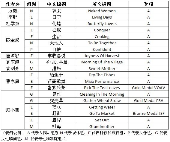 快讯—乌克兰第7届国际艺术摄影沙龙巡回赛-对女性的爱获奖成绩公布时间:2012年08月3日 来源:本站原创 乌克兰第7届国际艺术摄影沙龙巡回赛-对女性的爱(The 7th International Salon-Circuit of Art Photography “With love to Women”- 2012)近日公布结果,美国摄影学会(中国)(PSA China)根据大赛邮件统计,有19幅PSA China会员的作品获得入围以上奖项。其中,美国摄影学会(中国)(PSA China)会员廖小西先生的《拢麦草》(Gather Wheat Straw)荣获女性瞬间组PSA金奖,其作品《赶街》(Go To Market)荣获种族和旅行组ISF铜奖。会员曹家勇先生的作品《畲族采茶》(Pick The Tea Leaves)荣获种族和旅行组VÖAV金奖。在此,向两位会员表示衷心的祝贺! 以下为入围获奖名单: 乌克兰第7届国际艺术摄影沙龙巡回赛-对女性的爱由美国摄影学会(PSA)、国际影艺联盟(FIAP)、英国皇家摄影学会(RPS)、影艺无疆界(ISF)和欧洲摄影家联盟(UPI)等认证。所有入选作品将计入美国摄影学会(PSA)的“星标系统”和“世界摄影名人录”。本届影展设立彩色投影照片组Color Projected Image Division(CPID)一个大组别,下分为人像组(CPID)、母性和家庭(CPID)、女性瞬间(CPID)、种族和旅行(CPID)、时尚和魅力组(CPID)和裸体组 (CPID)六个小组别(Sections)。以下为获奖作品和部分入围作品: 廖小西女性瞬间组PSA金奖作品《拢麦草》