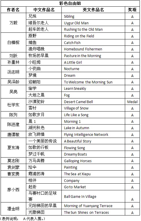 快讯—第十四届 PSSNY 国际沙龙摄影展览获奖成绩公布时间:2012年08月9日 来源:本站原创 第十四届 PSSNY 国际沙龙摄影展览(14th PSSNY Exhibition)近日公布结果,美国摄影学会(中国)(PSA China)根据大赛邮件统计,有30幅PSA China会员的作品获得入围以上奖项。其中,美国摄影学会(中国)(PSA China)会员杜学东先生的《沙漠驼铃》(Desert Camel Bell)荣获彩色自由组奖牌。在此,向这位会员表示衷心的祝贺! 以下为入围获奖名单: 第十四届 PSSNY 国际沙龙摄影展览由美国摄影学会(PSA)认证。所有入选作品将计入美国摄影学会(PSA)的“星标系统”和“世界摄影名人录”。本届影展设立彩色自由组一个组别。以下为获奖作品和部分入围作品: 杜学东获奖作品《沙漠驼铃》 万毅入围作品《兄妹》 白植槟入围作品《原野》 刘跃入围作品《牧场的早晨》 孙重林入围作品《小旺姆》 汤志明入围作品《梦境》 吴泽龄入围作品《迎朝阳》 吴亮入围作品《偷学》 陈列入围作品《如歌岁月》 陈进建入围作品《晨1》 唐谭敏入围作品《放飞网情》 夏东海入围作品《如歌的行板》 莫志刚入围作品《万马奔腾》 袁剑豪入围作品《绘伞》 曹家勇入围作品《霞浦的海》 廖小西入围作品《相伴》 潘金明入围作品《光撒梯田》 在此,美国摄影学会(中国)(PSA China)向所有在本届影展中获得优异成绩的中国参展者表示衷心的祝贺!