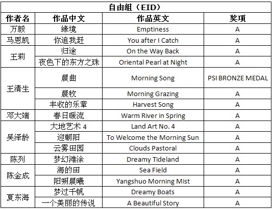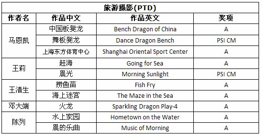 快讯——第13届PSI国际摄影展获奖成绩公布时间:2012年08月10日 来源:本站原创 第13届PSI国际摄影展(13th PSI International Salon-2012)近日公布结果,美国摄影学会(中国)(PSA China)根据大赛邮件统计,有29幅PSA China会员的作品获得入围以上奖项。其中,美国摄影学会(中国)(PSA China)会员王清生先生的《晨曲》(Morning Song)荣获自由组PSI铜奖,会员马恩凯先生的《舞板凳龙》(Dance Dragon Bench)荣获旅游摄影组PSI证书奖,会员王莉女士的《晨光》(Morning Sunlight)荣获旅游摄影组PSI证书奖。在此,向三位会员表示衷心的祝贺! 以下为入围获奖名单: (表例说明: A代表入围。排名先后按姓氏笔画。) 第13届PSI国际摄影展由美国摄影学会(PSA)和国际影艺联盟(FIAP)认证。所有入选作品将计入美国摄影学会(PSA)的“星标系统”和“世界摄影名人录”。本届影展设立彩色自由组、黑白自由组、自然组和旅游组。以下为获奖作品和部分入围作品: 王清生自由组PSI铜奖作品《晨曲》 马恩凯旅游摄影组PSI证书奖作品《舞板凳龙--浙江民俗》 王莉旅游摄影组PSI证书奖作品《晨光》