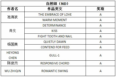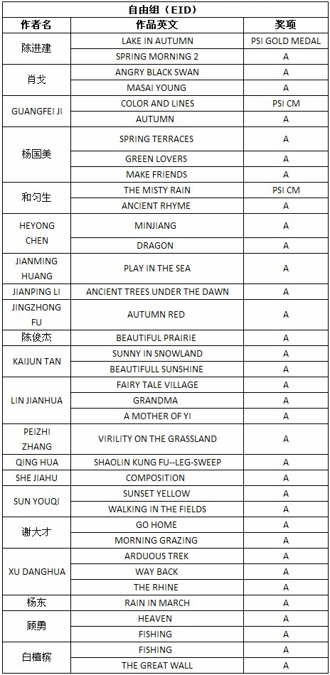 娄宝利自然组入围作品《恋爱中的情侣》 根据大赛公布的总成绩单,还有其他一些美国摄影学会(中国)PSA China会员和摄影朋友取得了不错的成绩,他们的获奖和入围作品如下: (排名不分先后) 在此,美国摄影学会(中国)(PSA China)向所有在本届影展中获得优异成绩的中国参展者表示衷心的祝贺! 欢迎转载,请注明出处! |
