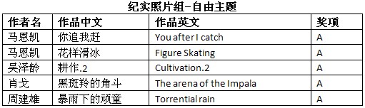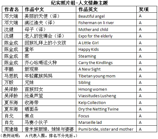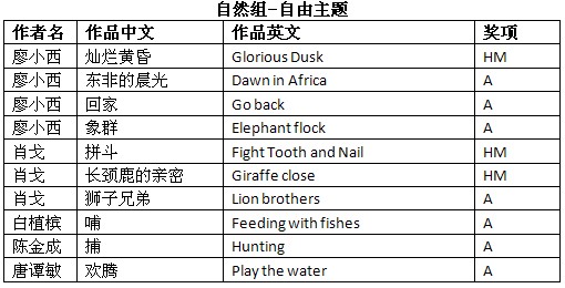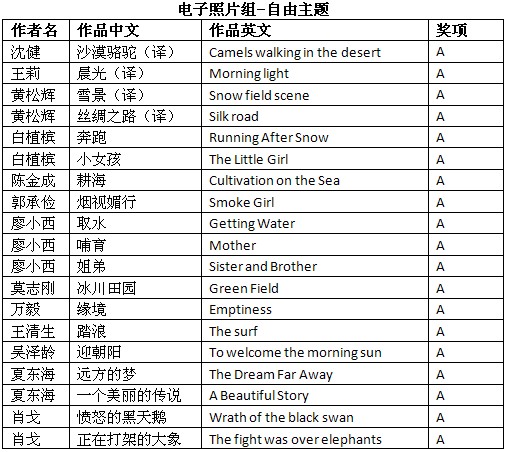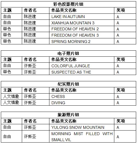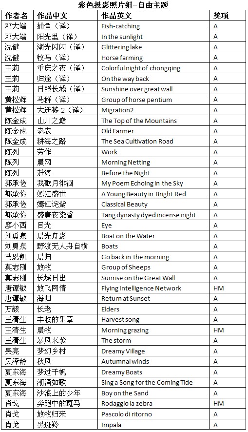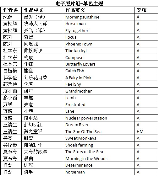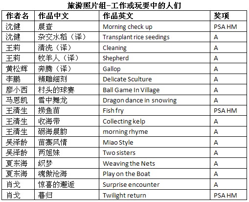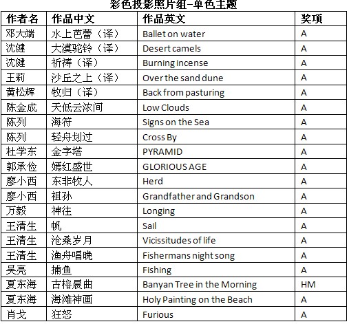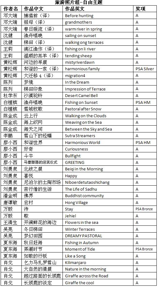 2012美国摄影学会(PSA)国际摄影展成绩公布时间:2012年09月04日 来源:本站原创 2012美国摄影学会(PSA)国际摄影展(2012 PSA INTERNATIONAL EXHIBITION)近日公布结果,美国摄影学会(中国)(PSA China)获得入围以上奖项的PSA China会员的作品达193幅。其中,会员唐谭敏女士的作品《放飞网情》(Flying Intelligence Network)、会员王清生先生的作品《晨牧》(Morning grazing)和肖戈先生的《奔跑中的斑马》(Rodaggio la zebra)分别荣获彩色投影照片组自由主题PSA绶带奖,会员夏东海先生的《古榕晨曲》(Banyan Tree in the Morning)荣获彩色投影照片组单色主题PSA绶带奖。会员王清生的作品《海之童谣》(The Son Of The Sea)荣获电子照片组单色主题PSA绶带奖。会员廖小西先生的作品《灿烂黄昏》(Glorious Dusk)、肖戈先生的作品《拼斗》(Fight Tooth and Nail)和作品《长颈鹿的亲密》(Giraffe close)分别荣获自然组PSA绶带奖。会员黄松辉先生的作品《和谐的一家》(译)(harmonious family)荣获旅游照片组自由主题PSA银奖,万毅先生的作品《待》(Stay)和夏东海先生的作品《弄潮世界》(Moment of Tide)分别荣获旅游照片组自由主题PSA铜奖。会员白植槟先生的《渔舟唱晚》(Fishing on Sunset)和廖小西先生的《和谐世界》(Harmonious World)分别荣获旅游照片组自由主题PSA绶带奖。会员沈健先生的作品《晨查》(Morning check up),王清生先生的《捞鱼苗》(Fish fry)和肖戈的作品《暮归》(Twilight return)分别荣获旅游照片组工作或玩耍中的人们主题PSA绶带奖。在此,向九位会员表示衷心的祝贺! 以下为入围获奖名单: 2012美国摄影学会(PSA)国际摄影展所有会员的入选作品将计入美国摄影学会(PSA)的“星标系统”和“世界摄影名人录”。本届影展设立彩色投影照片组、电子照片组、自然组、旅游照片组和新闻纪实组五大类别,下分9个小组别。以下为获奖作品和部分入围作品: 黄松辉旅游照片组自由主题PSA银奖作品《和谐的一家》 万毅旅游照片组自由主题PSA铜奖作品《待》 夏东海旅游照片组自由主题PSA铜奖作品《弄潮时节》 唐谭敏彩色投影照片组自由主题PSA绶带奖作品《放飞网情》 王清生彩色投影照片组自由主题PSA绶带奖作品《晨牧》 肖戈彩色投影照片组自由主题PSA绶带奖作品《奔跑中的斑马》 夏东海彩色投影照片组单色主题PSA绶带奖作品《古榕晨曲》 王清生电子照片组单色主题PSA绶带奖作品《海之童谣》 廖小西自然组PSA绶带奖作品《灿烂黄昏》 肖戈自然组PSA绶带奖作品《拼斗》 肖戈自然组PSA绶带奖作品《长颈鹿的亲密》 白植槟旅游照片组自由主题PSA绶带奖作品《渔舟唱晚》 廖小西旅游照片组自由主题PSA绶带奖作品《和谐世界》 沈健旅游照片组工作或玩耍中的人们主题PSA绶带奖作品《晨查》 王清生旅游照片组工作或玩耍中的人们主题PSA绶带奖作品《捞鱼苗》 肖戈旅游照片组工作或玩耍中的人们主题PSA绶带奖作品《暮归》 邓大端彩色投影照片组自由主题入围作品《阳光里》 王莉彩色投影照片组单色主题入围作品《沙丘之上》 陈金成彩色投影照片组自由主题入围作品《耕海之路》 陈列彩色投影照片组自由主题入围作品《劳作》 郭承俭彩色投影照片组自由主题入围作品《嫣红姹紫》 刘勇泉彩色投影照片组自由主题入围作品《野渡无人舟自横》 杜学东彩色投影照片组单色主题入围作品《金字塔》 吴泽龄电子照片组自由主题入围作品《迎朝阳》 莫志刚电子照片组自由主题入围作品《冰川田园》 潘金明旅游照片组自由主题入围作品《佛界》 吴亮电子照片组单色主题入围作品《甜蜜》 李鹏纪实照片组人文情趣主题入围作品《新观察》 马恩凯纪实照片组人文情趣主题入围作品《年轻藏族妈妈》 周建雄纪实照片组自由主题入围作品《暴雨下的顽童》 根据大赛公布的总成绩单,还有其他一些美国摄影学会(中国)PSA China会员和摄影朋友取得了不错的成绩,他们的获奖和入围作品如下: 在此,美国摄影学会(中国)(PSA China)向所有在本届影展中获得优异成绩的中国参展者表示衷心的祝贺!