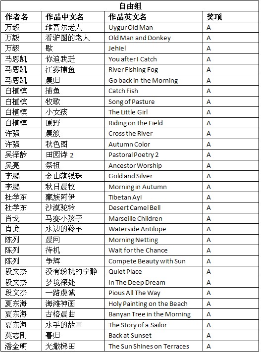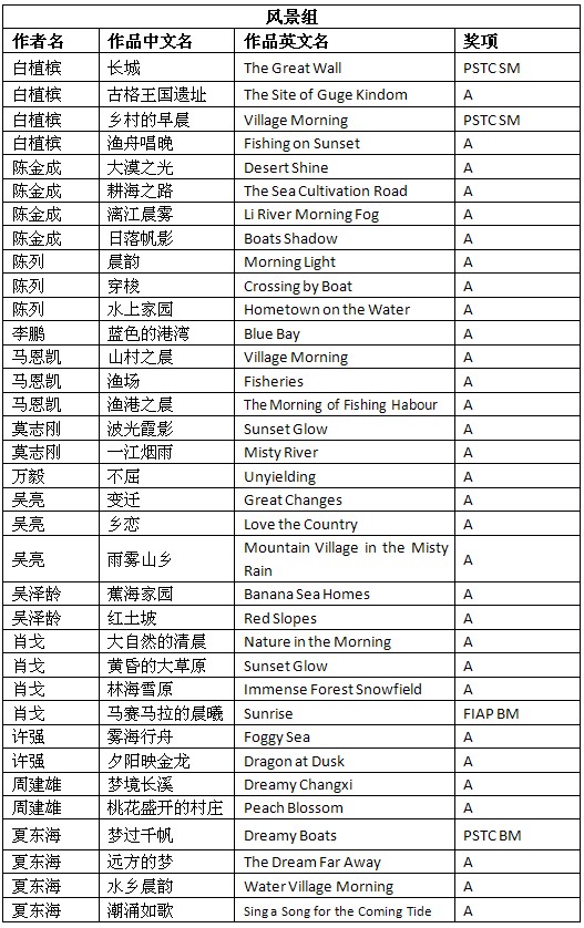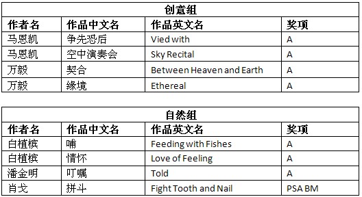 快讯—2012第二届台中国际摄影艺术展览获奖成绩公布时间:2012年9月6日 来源:本站原创 2012 第二届台中国际摄影艺术展览(The 2nd Taichung International Exhibition of photography)近日公布结果,美国摄影学会(中国)(PSA China)根据大赛邮件统计,PSA China会员获得入围以上奖项的作品达74幅。其中,美国摄影学会(中国)(PSA China)会员白植槟先生的作品《长城》(The Great Wall)和《乡村的早晨》(Village Morning)分别荣获风景组台中会(PSTC)银牌奖。会员肖戈先生的作品《马赛马拉的晨曦》(Sunrise)荣获风景组国际影联(FIAP)铜牌奖,其作品《拼斗》(Fight Tooth and Nail)荣获自然组美国摄影学会(PSA)铜牌奖。会员夏东海先生的作品《梦过千帆》(Dreamy Boats)荣获风景组台中会(PSTC)铜牌奖。在此,向三位会员表示衷心的祝贺! 以下为入围获奖名单: (表格注释:A代表入围,PSA BM代表PSA铜牌奖,FIAP BM 代表FIAP铜牌奖,PSTC SM代表PSTC银牌奖,PSTC BM 代表PSTC铜牌奖,排名按作者姓氏笔画。) 2012 第二届台中国际摄影艺术展览由美国摄影学会(PSA)和国际影艺联盟(FIAP)认证。所有PSA会员的入选作品将计入美国摄影学会(PSA)的“星标系统”和“世界摄影名人录”。本届影展设立自由组、风景组、电子照片组和自然组四个组别。以下为获奖作品和部分入围作品: 白植槟风景组台中会(PSTC)银牌奖作品《长城》 白植槟风景组台中会(PSTC)银牌奖作品《乡村的早晨》 肖戈风景组国际影联(FIAP)铜牌奖作品《马赛马拉的晨曦》 肖戈自然组美国摄影学会(PSA)铜牌奖作品《拼斗》 夏东海风景组台中会(PSTC)铜牌奖作品《梦过千帆》 万毅自由组入围作品《看驴圈的老人》 马恩凯自由组入围作品《晨归》 许强自由组入围作品《秋色图》 吴泽龄自由组入围作品《田园诗》 吴亮自由组入围作品《祭祖》 李鹏自由组入围作品《秋日晨牧》 杜学东自由组入围作品《沙漠驼铃》 陈列自由组入围作品《待机》 段文杰自由组入围作品《梦境深处》 莫志刚自由组入围作品《暮归》 潘金明自由组入围作品《光撒梯田》 陈金成自由组入围作品《大漠之光》 周建雄风景组入围作品《桃花盛开的村庄》 在此,美国摄影学会(中国)(PSA China)向所有在本届影展中获得优异成绩的中国参展者表示衷心的祝贺! |