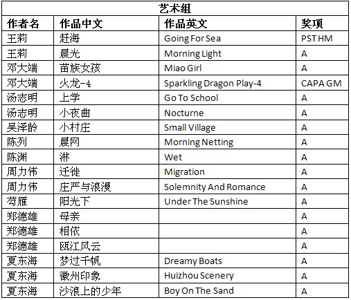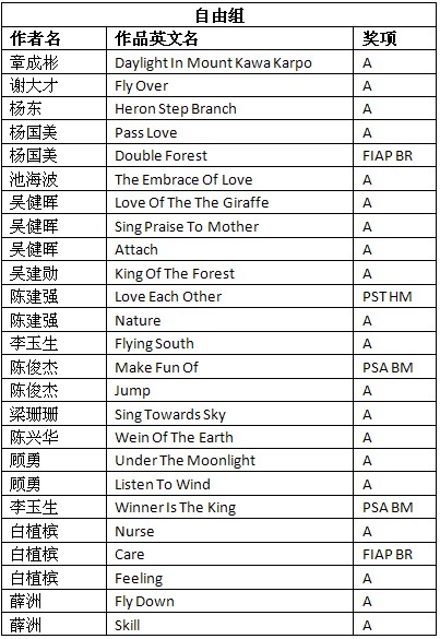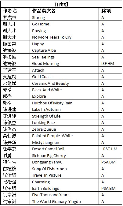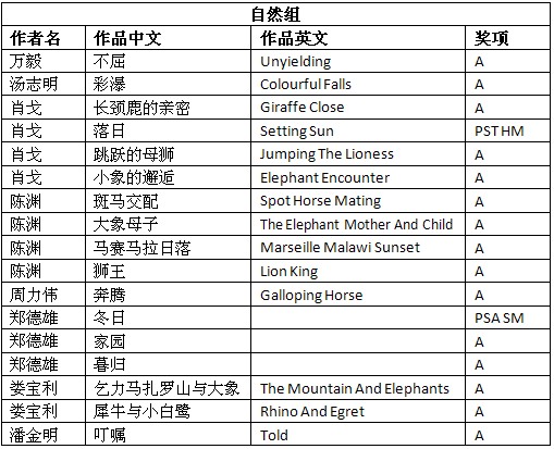 第三十六届台北国际摄影展获奖成绩公布时间:2012年9月24日 来源:本站原创 第三十六届台北国际摄影展(36th TAIPEI INTERNATIONAL SALON OF PHOTOGRAPHY 2012)近日公布结果,美国摄影学会(中国)(PSA China)根据大赛总成绩统计,PSA China会员有36幅作品获得入围以上奖项。其中,美国摄影学会(中国)(PSA China)会员邓大端先生的作品《火龙-4》(Sparkling Dragon Play-4)荣获艺术组CAPA GM 中华艺术摄影家金牌,会员王莉女士的作品《赶海》(Go for Sea)荣获艺术组PST HM 台北摄影学会奖状,会员郑德雄先生的作品《冬日》荣获自然组PSA SM 美国摄影学会银奖,会员肖戈先生的作品《落日》(Setting Sun)荣获自然组PST HM 台北摄影学会奖状。在此,向四位会员表示衷心的祝贺! 以下为入围获奖名单: (A代表入围;PST HM代表台北摄影学会奖状;CAPA GM代表中华艺术摄影家金牌;PSA SM代表美国摄影学会银牌。排名按作者姓氏笔画。) 第三十六届台北国际摄影展由美国摄影学会(PSA)、国际影艺联盟(FIAP)和影像无疆界(ISF)认证。所有PSA会员的入选作品将计入美国摄影学会(PSA)的“星标系统”和“世界摄影名人录”。本届影展设立艺术组和自然组两个组别。以下为部分获奖和入围作品: 邓大端荣获艺术组中华艺术摄影家金牌作品《火龙-4》 王莉艺术组荣获台北会奖状作品《赶海》 肖戈自然组荣获台北会奖状作品《落日》 郑德雄自然组荣获美国摄影学会银牌作品《冬日》 汤志明艺术组入围作品《上学》 吴泽龄艺术组入围作品《小村庄》 陈列艺术组入围作品《晨网》 陈渊艺术组入围作品《淋》 周力伟艺术组入围作品《迁徙》 芶雁艺术组入围作品《阳光下》 夏东海艺术组入围作品《沙浪上的少年》 万毅自然组入围作品《不屈》 娄宝利自然组入围作品《犀牛与小白鹭》 潘金明自然组入围作品《叮嘱》 根据大赛公布的总成绩单,还有其他一些美国摄影学会(中国)PSA China会员和摄影朋友取得了不错的成绩,他们的获奖和入围作品如下: (A代表入围;ISF HM代表法国影像无疆界奖状;PST HM代表台北摄影学会奖状;PSA BM 代表美国摄影学会铜牌;FIAP BR代表国际影艺联盟蓝带奖。排名按作者姓氏笔画。) 在此,美国摄影学会(中国)(PSA China)向所有在本届影展中获得优异成绩的中国参展者表示衷心的祝贺! |