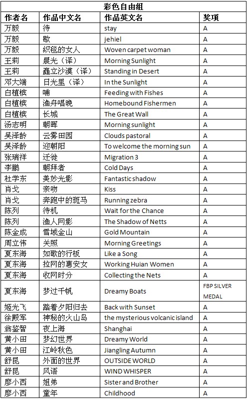 2012年ISO国际摄影展获奖成绩公布时间:2012年11月2日来源:本站原创 2012年ISO国际摄影展(International SillianOrganisationISO2012)近日公布结果,美国摄影学会(中国)(PSA China)会员们在此次巡回赛中喜获佳绩。根据大赛总成绩统计,美国摄影学会(中国)(PSA China)会员有81幅作品获得入围以上奖项。其中,会员夏东海先生的作品《梦过千帆》(Dreamy Boats)荣获彩色自由组FBP银奖。在此,向这位会员表示衷心的祝贺! 以下为入围获奖名单: 2012年ISO国际摄影展由美国摄影学会(PSA)、欧洲国际影艺联盟(FIAP)和荷兰国际摄影家联盟(UPI)认证。所有PSA会员的入选作品将计入美国摄影学会(PSA)的“星标系统(PSA Star Ratings)”和“世界摄影名人录(Who’s Who in Photography)”。本届影展设立彩色自由组、单色自由组和创意组,共三个组别。以下为获奖作品和部分入围作品: 夏东海彩色自由组FBP银奖作品《梦过千帆》 万毅彩色自由组入围作品《织毯的女人》 王莉彩色自由组入围作品《晨光》 邓大端彩色自由组入围作品《日光里》 白植槟彩色自由组入围作品《哺》 汤志明单色自由组入围作品《高原之晨》 吴泽龄单色自由组入围作品《波光帆影》 张瑞祥彩色自由组入围作品《迁徙3》 李鹏彩色自由组入围作品《朝拜者》 杜学东彩色自由组入围作品《美妙光影》 肖戈彩色自由组入围作品《亲吻》 陈列彩色自由组入围作品《待机》 陈金成单色自由组入围作品《山水云幽幽》 周立伟彩色自由组入围作品《关照》 姬光飞创意组入围作品《树》 徐殿军彩色自由组入围作品《神秘的火山岛》 翁鉴智彩色自由组入围作品《夜上海》 黄小田彩色自由组入围作品《江岭秋色》 舒昆彩色自由组入围作品《风语》 廖小西彩色自由组入围作品《姐弟》 马恩凯单色自由组入围作品《江雾小船》 邓冬林单色自由组入围作品《修行》 许强单色自由组入围作品《浣衣女》 张志宏单色自由组入围作品《武当论剑》 周建雄单色自由组入围作品《美国滑水运动员》