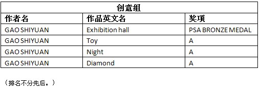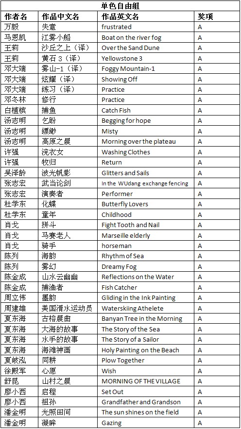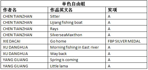 夏岐泓单色自由组入围作品《同耕》 潘金明单色自由组入围作品《凝眸》 根据大赛公布的总成绩单,还有其他一些美国摄影学会(中国)PSA China会员和摄影朋友取得了不错的成绩,他们的获奖和入围作品如下: 在此,美国摄影学会(中国)(PSAChina)向所有在本届影展中获得优异成绩的中国参展者表示衷心的祝贺! |