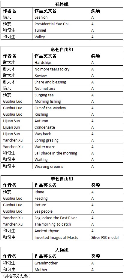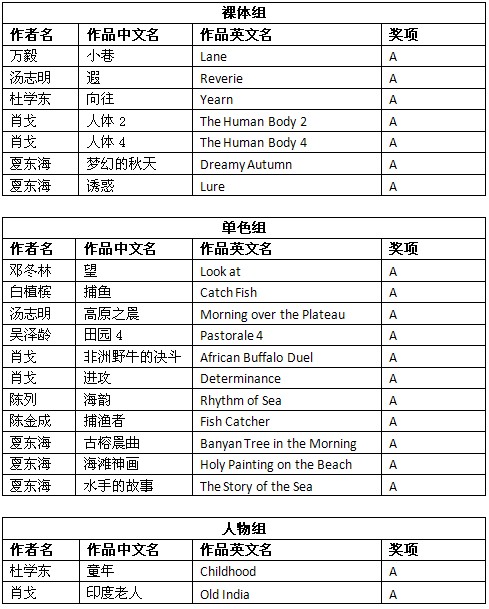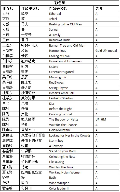 塞尔维亚第二届CACAK国际摄影展获奖成绩公布时间:2012年11月7日 来源:本站原创 塞尔维亚第二届CACAK国际摄影展(2nd International Salon of Photography CACAK 2012)近日公布结果,美国摄影学会(中国)(PSA China)会员们在此次巡回赛中喜获佳绩。根据大赛总成绩统计,美国摄影学会(中国)(PSA China)会员有54幅作品获得入围以上奖项。其中,会员王黎东先生的作品《和谐》(Harmonious)荣获彩色自由组UPI金奖。会员陈列先生的作品《渔人网影》(The Shadow of Netts)荣获彩色自由组UPI绶带奖。在此,向两位会员表示衷心的祝贺! 以下为入围获奖名单: (排名按作者姓氏笔画。A代表入围。Gold UPI medal代表UPI金奖,UPI HM代表UPI绶带奖。) 塞尔维亚第二届CACAK国际摄影展由美国摄影学会(PSA)、欧洲国际影艺联盟(FIAP)和国际摄影家联盟(UPI)认证。所有PSA会员的入选作品将计入美国摄影学会(PSA)的“星标系统(PSA Star Ratings)”和“世界摄影名人录(Who’s Who in Photography)”。本届影展设立裸体组、彩色自由组、单色自由组和人物组,共四个组别。以下为获奖作品和部分入围作品: 王黎东彩色自由组UPI金奖作品《和谐》 陈列彩色自由组UPI绶带奖作品《渔人网影》 万毅彩色自由组入围作品《歇》 汤志明单色自由组入围作品《高原之晨》 杜学东人物组入围作品《童年》 肖戈单色自由组入围作品《非洲野牛的决斗》 夏东海彩色自由组入围作品《收网时分》 王伟彩色自由组入围作品《暮归》 白植槟彩色自由组入围作品《姐妹》 吴泽龄彩色自由组入围作品《碧波》 陈金成彩色自由组入围作品《雪域金山》 周建雄彩色自由组入围作品《暴雨下的顽童》 周道琼彩色自由组入围作品《牧童》 娄宝利彩色自由组入围作品《牛背鹳》 舒昆彩色自由组入围作品《浴》 潘金明彩色自由组入围作品《彩梯II》 邓冬林单色自由组入围作品《望》 根据大赛公布的总成绩单,还有其他一些美国摄影学会(中国)PSA China会员和摄影朋友取得了不错的成绩,他们的获奖和入围作品如下: 在此,美国摄影学会(中国)(PSA China)向所有在本届影展中获得优异成绩的中国参展者表示衷心的祝贺!