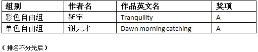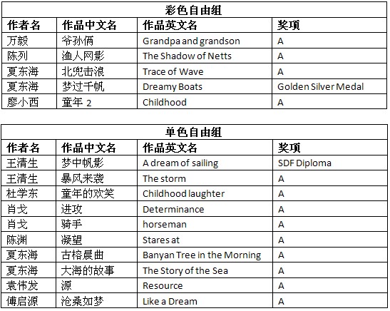 2012年丹麦第三届国际金色数码摄影展获奖成绩公布时间:2012年11月08日 来源:本站原创 2012年丹麦第三届国际金色数码摄影展(3’rd Golden Digital Salon 2012)近日公布结果。根据大赛总成绩统计,美国摄影学会(中国)(PSA China)会员有15幅作品获得入围以上奖项。其中,会员夏东海先生的作品《梦过千帆》(Dreamy Boats)荣获彩色自由组Golden沙龙银奖。会员王清生先生的作品《梦中帆影》(A Dream of Sailing)荣获单色自由组SDF证书奖。在此,向两位会员表示衷心的祝贺! 以下为入围获奖名单: (排名按作者姓氏笔画。A代表入围。Golden Silver Medal代表沙龙银奖,SDF Diploma代表SDF证书奖。) 2012年丹麦第三届国际金色数码摄影展由美国摄影学会(PSA)和国际影艺联盟(FIAP)认证。所有PSA会员的入选作品将计入美国摄影学会(PSA)的“星标系统(PSA Star Ratings)”和“世界摄影名人录(Who’s Who in Photography)”。本届影展设立彩色自由组和单色自由组2个组别。以下为获奖作品和部分入围作品: 夏东海彩色自由组沙龙银奖作品《梦过千帆》 王清生单色自由组SDF证书奖《梦中帆影》 万毅彩色自由组入围作品《爷孙俩》 陈列彩色自由组入围作品《渔人网影》 廖小西彩色自由组入围作品《童年2》 杜学东单色自由组入围作品《童年的欢笑》 肖戈单色自由组入围作品《骑手》 陈渊单色自由组入围作品《凝望》 袁伟发单色自由组入围作品《源》 傅启源单色自由组入围作品《沧桑如梦》 根据大赛公布的总成绩单,还有其他一些美国摄影学会(中国)PSA China会员和摄影朋友的入围作品如下: 在此,美国摄影学会(中国)(PSA China)向所有在本届影展中获得优异成绩的中国参展者表示衷心的祝贺!