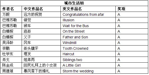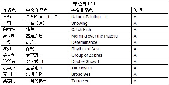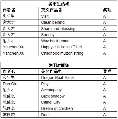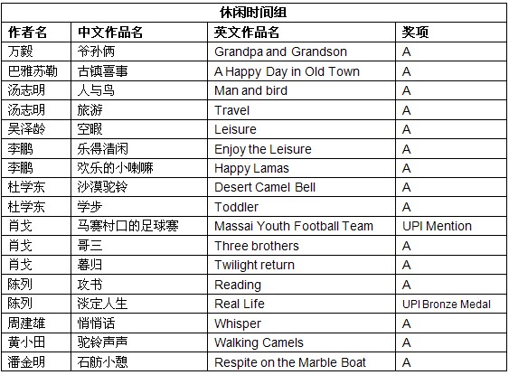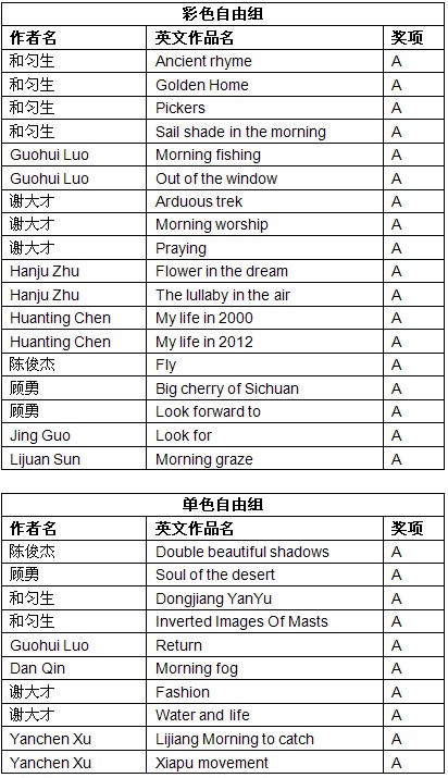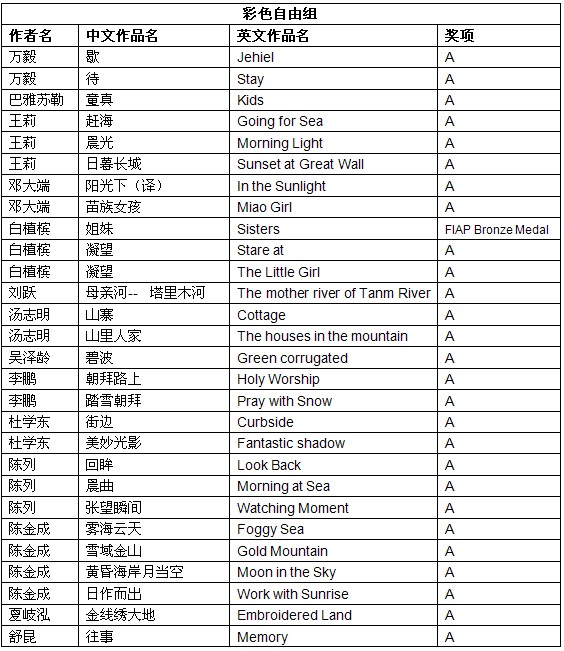 塞尔维亚第二届BELGRADE秋季国际摄影展获奖成绩公布时间:2012年11月16日 来源:本站原创 塞尔维亚第二届BELGRADE秋季国际摄影展(2nd Salon international of Digital Photography Belgrade Photo Autumn)近日公布结果,美国摄影学会(中国)(PSA China)会员们在此次巡回赛中喜获佳绩。根据大赛总成绩统计,美国摄影学会(中国)(PSA China)会员有67幅作品获得入围以上奖项。其中,会员陈列先生的作品《淡定人生》(Real Life)在休闲时间组荣获UPI铜奖,会员白植槟先生的作品《姐妹》(Sisters)在彩色自由组荣获FIAP铜奖,会员肖戈先生的作品《马赛村口的足球赛》(Massai Youth Football Team)在休闲时间组荣获UPI绶带奖。在此,向三位会员表示衷心的祝贺! 以下为入围获奖名单: (排名按作者姓氏笔画。A代表入围。UPI Bronze Medal代表铜奖,FIAP Bronze Medal代表FIAP铜奖,UPI Mention代表UPI绶带奖。) 塞尔维亚第二届BELGRADE秋季国际摄影展由美国摄影学会(PSA)、欧洲国际影艺联盟(FIAP)、国际摄影家联盟(UPI)和塞尔维亚摄影学会(FSS)认证。所有PSA会员的入选作品将计入美国摄影学会(PSA)的“星标系统(PSA Star Ratings)”和“世界摄影名人录(Who’s Who in Photography)”。本届影展设立城市生活组、休闲时间组、彩色自由组和单色自由组,共四个组别。以下为获奖作品和部分入围作品: 陈列休闲时间组UPI铜奖作品《淡定人生》 白植槟彩色自由组FIAP铜奖作品《姐妹》 肖戈休闲时间组UPI绶带奖作品《马赛村口的足球赛》 万毅城市生活组入围作品《远方的祝贺》 巴雅苏勒城市生活组入围作品《错觉》 吴泽龄城市生活组入围作品《风车》 李鹏城市生活组入围作品《街头镶牙》 杜学东城市生活组入围作品《理发》 陈金成城市生活组入围作品《回民礼拜上的小女孩》 周建雄城市生活组入围作品《暴风雪下的婚礼》 汤志明休闲时间组入围作品《人与鸟》 黄小田休闲时间组入围作品《驼铃声声》 潘金明休闲时间组入围作品《石舫小憩》 王莉彩色自由组入围作品《赶海》 邓大端彩色自由组入围作品《苗族女孩》 刘跃彩色自由组入围作品《母亲河--塔里木河》 夏岐泓彩色自由组入围作品《金线绣大地》 舒昆彩色自由组入围作品《往事》 娄宝利单色自由组入围作品《食草斑马》 莫志刚单色自由组入围作品《一弯的梯田》 根据大赛公布的总成绩单,还有其他一些美国摄影学会(中国)PSA China会员和摄影朋友取得了不错的成绩,他们的获奖和入围作品如下: 在此,美国摄影学会(中国)(PSA China)向所有在本届影展中获得优异成绩的中国参展者表示衷心的祝贺! |