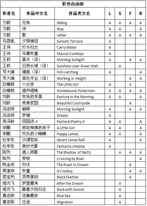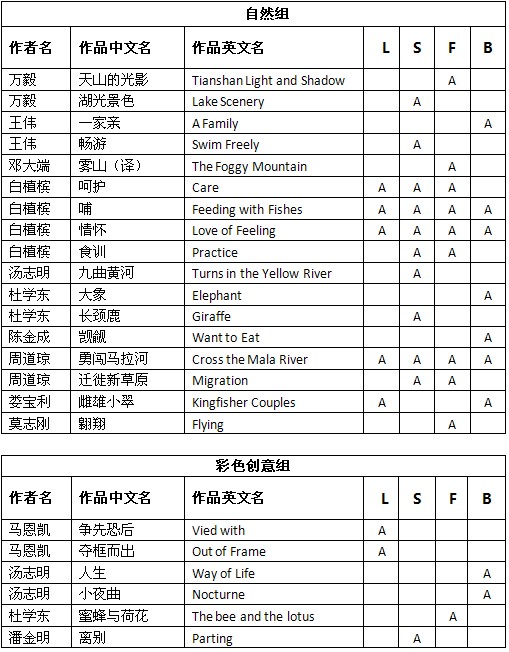 2012年第7届法国数码巡回赛获奖成绩公布时间:2012年11月29日 来源:本站原创 2012年第7届法国数码巡回赛(7° FRENCH DIGITAL TOUR - 2012)近日公布结果,美国摄影学会(中国)(PSA China)会员们在此次巡回赛中喜获佳绩。根据大赛总成绩统计,美国摄影学会(中国)(PSA China)会员有97幅作品获得入围以上奖项。 以下为入围获奖名单: (排名按作者姓氏笔画。A代表入围。L代表Legé赛区,S代表Saint Aignan de Cr赛区,F代表Foix赛区,B代表Bagnols M赛区。) 2012年第7届法国数码巡回赛由美国摄影学会(PSA)、国际影艺联盟(FIAP)、国际摄影家联盟(UPI)和影艺无疆界(ISF)认证。所有PSA会员的入选作品将计入美国摄影学会(PSA)的“星标系统(PSA Star Ratings)”和“世界摄影名人录(Who’s Who in Photography)”。本届影展设立彩色自由组、自然组和创意组,共三个组别。以下为部分入围作品: 万毅彩色自由组入围作品《歇》 马恩凯彩色创意组入围作品《夺框而出》 王伟彩色自由组入围作品《打水妇女》 王莉彩色自由组入围作品《日照长城》 邓大端彩色自由组入围作品《捕鱼》 白植槟自然组入围作品《情怀》 刘跃彩色自由组入围作品《秀美家园》 汤志明彩色自由组入围作品《朝晖》 吴泽龄彩色自由组入围作品《田园诗4》 李鹏彩色自由组入围作品《欢乐的小喇嘛》 杜学东彩色自由组入围作品《美妙光影》 陈列彩色自由组入围作品《渔人网影》 陈金成彩色自由组入围作品《向往》 周道琼自然组入围作品《迁徙新草原》 娄宝利自然组入围作品《雌雄小翠》 姬光飞彩色自由组入围作品《梦里醒来》 莫志刚彩色自由组入围作品《迁徙》 潘金明彩色创意组入围作品《离别》 根据大赛公布的总成绩单,还有其他一些美国摄影学会(中国)PSA China会员和摄影朋友取得了不错的成绩,他们的获奖和入围作品详见:《成绩表》(点击浏览) 在此,美国摄影学会(中国)(PSA China)向所有在本届影展中获得优异成绩的中国参展者表示衷心的祝贺!