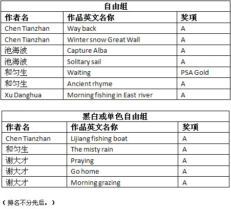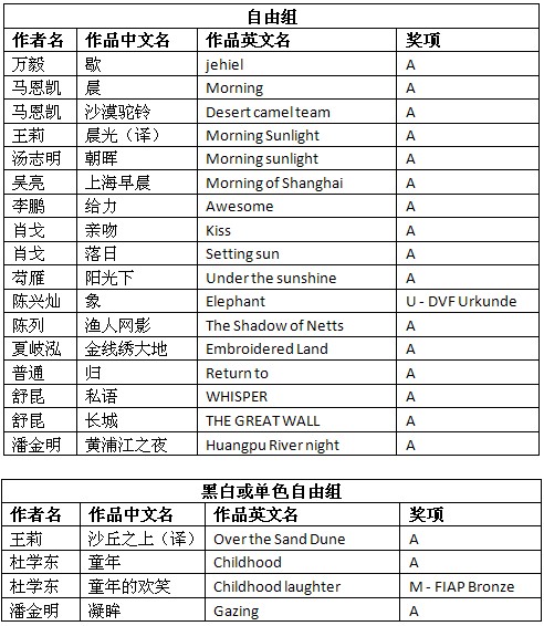 德国第12届DVF国际数码摄影展获奖成绩公布时间:2012年12月5日 来源:本站原创 德国第12届DVF国际数码摄影展(12th International DVF Digital Imaging Competition 2012)近日公布结果。根据大赛总成绩统计,美国摄影学会(中国)(PSA China)会员有21幅作品获得入围以上奖项。其中,会员杜学东的作品《童年的欢笑》(Childhood laughter)荣获黑白或单色自由组FIAP铜奖,会员陈兴灿的作品《象》(Elephant)荣获自由组DVF证书奖。在此,向两位会员表示衷心的祝贺! 以下为入围获奖名单: (排名按姓名排序。A代表入围,U - DVF Urkunde代表DVF证书奖,M - FIAP Bronze代表FIAP铜奖。) 德国第12届DVF国际数码摄影展由美国摄影学会(PSA)和国际影艺联盟(FIAP)认证。所有PSA会员的入选作品将计入美国摄影学会(PSA)的“星标系统(PSA Star Ratings)”和“世界摄影名人录(Who’s Who in Photography)”。本届影展设立自由组、黑白或单色自由组,共2个组别。以下为获奖作品和部分入围作品: 杜学东黑白或单色自由组FIAP铜奖作品《童年的欢笑》 陈兴灿自由组DVF证书奖作品《象》 万毅自由组入围作品《歇》 马恩凯自由组入围作品《沙漠驼铃》 王莉彩色自由组入围作品《晨光》 汤志明自由组入围作品《朝晖》 吴亮自由组入围作品《上海早晨》 李鹏自由组入围作品《给力》 肖戈自由组入围作品《落日》 芶雁自由组入围作品《阳光下》 陈列自由组入围作品《渔人网影》 夏岐泓自由组入围作品《金线绣大地》 普通自由组入围作品《归》 舒昆自由组入围作品《私语》 潘金明自由组入围作品《黄浦江之夜》 根据大赛公布的总成绩单,还有其他一些美国摄影学会(中国)PSA China会员和摄影朋友取得了不错的成绩,他们的获奖和入围作品如下: 在此,美国摄影学会(中国)(PSA China)向所有在本届影展中获得优异成绩的中国参展者表示衷心的祝贺!