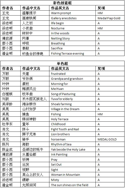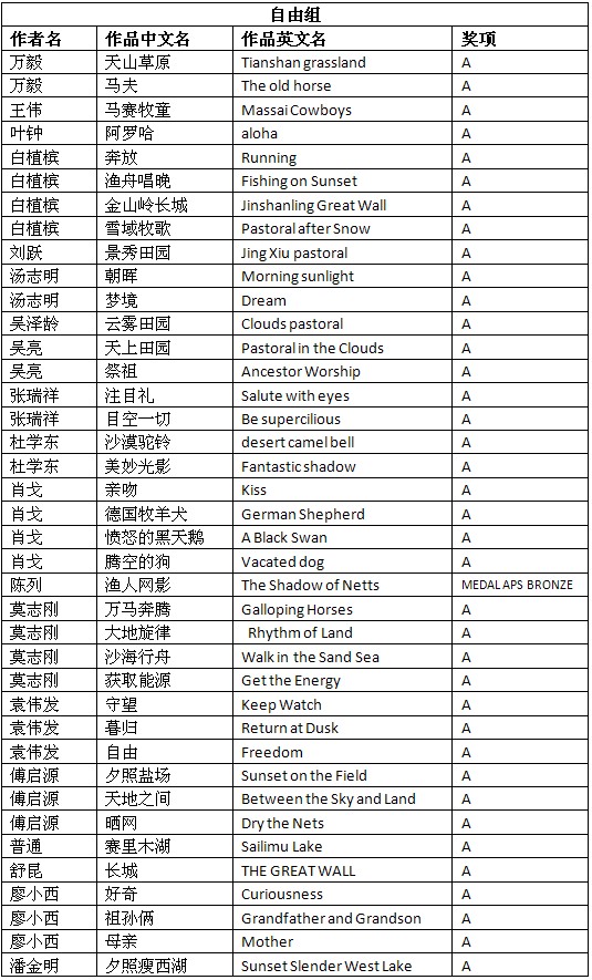 快讯—2012美国亚利桑那国际数码摄影展成绩公布时间:2012年12月7日 来源:本站原创 2012美国亚利桑那国际数码摄影展(Arizona Photographic Society Electronic Imaging Exhibition AZPS 2012)近日公布结果,美国摄影学会(中国)(PSA China)根据大赛邮件统计,PSA China会员有71幅作品获得入围以上奖项。其中,会员王龙的作品《画廊轶闻》(Gallery anecdotes)和《温馨提示》(Warm prompt)分别荣获彩色创意组FIAP金奖和HM绶带奖。会员肖戈的作品《骑手》(horseman)荣获单色组金奖。会员陈列的作品《渔人网影》(The Shadow of Netts)荣获自由组APS铜奖。会员汤志明的作品《小夜曲》(Nocturne)荣获彩色创意组HM绶带奖。会员吴亮的作品《捕鱼》(Fishing)荣获单色组HM绶带奖。在此,向五位会员表示祝贺! 以下为入围获奖名单: (A代表入围,排名按作者姓氏笔画。HM代表绶带奖。Medal Fiap Gold代表FIAP金奖,MEDAL GOLD代表金奖,MEDAL APS BRONZE代表APS铜奖。) 2012美国亚利桑那国际数码摄影展由美国摄影学会(PSA)和国际影艺联盟(FIAP)认证。所有PSA会员的入选作品将计入美国摄影学会(PSA)的“星标系统(PSA Star Ratings)”和“世界摄影名人录(Who’s Who in Photography)”。本届影展设立自由组、彩色创意组和单色组,共3个组别。以下为获奖作品和部分入围作品: 王龙彩色创意组FIAP金奖作品《画廊轶事》 王龙彩色创意组HM绶带奖作品《温馨提示》 肖戈单色组金奖作品《骑手》 陈列自由组APS铜奖作品《渔人网影》 吴亮单色组HM绶带奖作品《捕鱼》 万毅自由组入围作品《天山草原》 王伟自由组入围作品《马赛牧童》 叶钟单色组入围作品《梅源风云》 白植槟自由组入围作品《金山岭长城》 刘跃自由组入围作品《景秀田园》 吴泽龄单色组入围作品《滩涂耕作》 张瑞祥自由组入围作品《注目礼》 杜学东自由组入围作品《美妙光影》 莫志刚自由组入围作品《获取能源》 袁伟发自由组入围作品《自由》 傅启源自由组入围作品《夕照盐场》 普通自由组入围作品《赛里木湖》 舒昆自由组入围作品《长城》 廖小西自由组入围作品《好奇》 潘金明自由组入围作品《夕照瘦西湖》 陈金成单色组入围作品《圣湖边的牦牛》 在此,美国摄影学会(中国)(PSA China)向所有在本届影展中获得优异成绩的中国参展者表示衷心的祝贺!