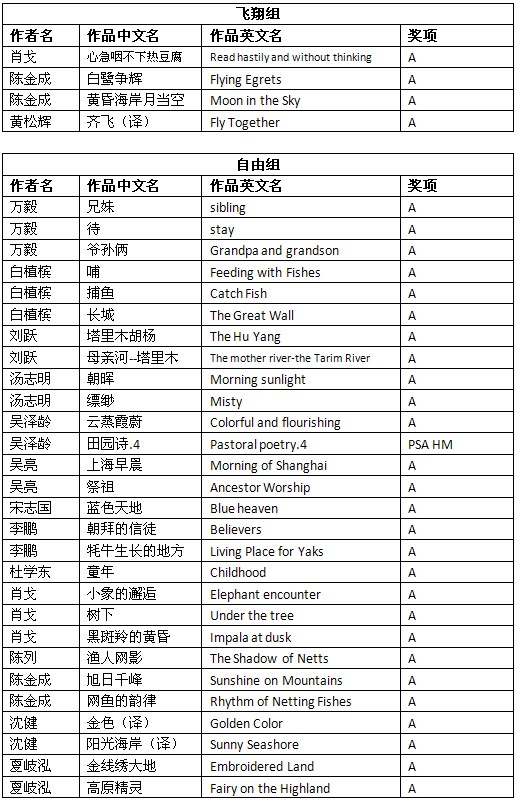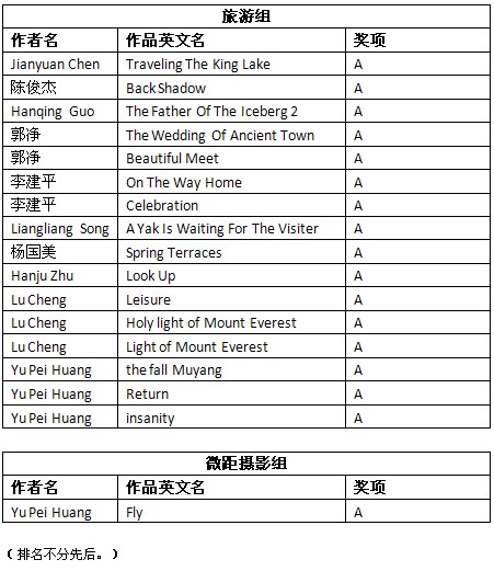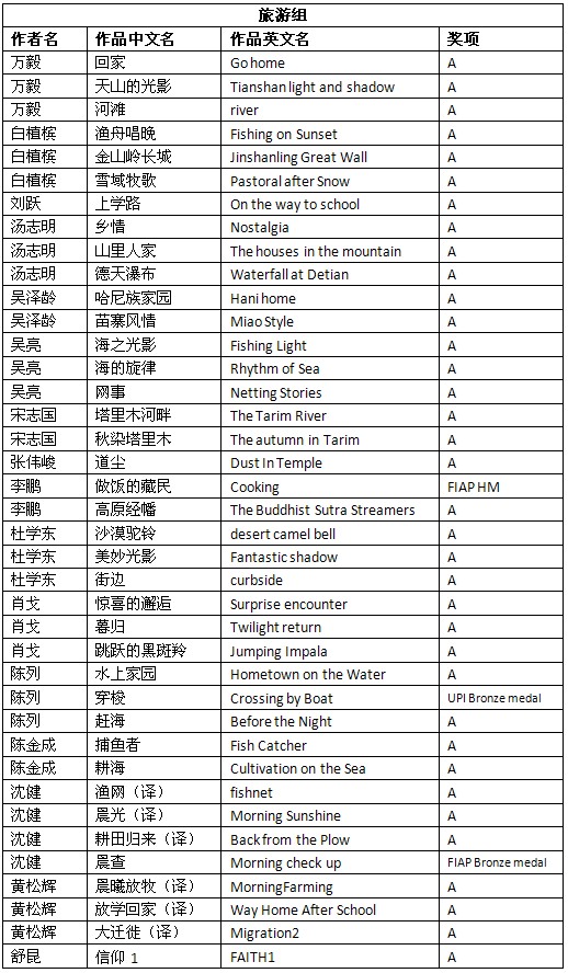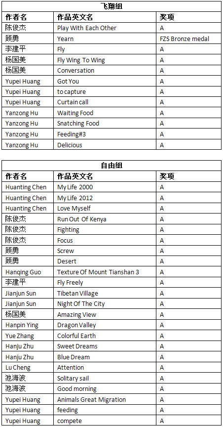 2012年斯洛文尼亚第4届“天地之间”国际摄影展获奖成绩公布时间:2012年12月17日 来源:本站原创 2012年斯洛文尼亚第4届“天地之间”国际摄影展(4rd International Salon of Photography Between the Sky and the Earth 2012)近日公布结果。根据大赛总成绩统计,美国摄影学会(中国)(PSA China)会员有71幅作品获得入围以上奖项。其中,会员陈列的作品《穿梭》(Crossing by Boat)荣获旅游组UPI铜奖,会员沈健的作品《晨查》(Morning check up)荣获旅游组FIAP铜奖,会员李鹏的作品《做饭的藏民》(Cooking)荣获旅游组FIAP绶带奖,会员吴泽龄的作品《田园4》(Pastoral poetry.4)荣获自由组PSA绶带奖。在此,向四位会员表示衷心的祝贺! 以下为入围获奖名单: (排名按姓氏笔画。A代表入围。UPI Bronze medal代表UPI铜奖,FIAP Bronze medal代表FIAP铜奖,PSA HM代表PSA绶带奖,FIAP HM 代表FIAP绶带奖。) 2012年斯洛文尼亚第4届“天地之间”国际摄影展由FIAP(国际影艺联盟)、PSA(美国摄影学会),UPI(国际摄影家联盟)和FZS(斯洛文尼亚摄影学会)认证。所有PSA会员的入选作品将计入美国摄影学会(PSA)的“星标系统(PSA Star Ratings)”和“世界摄影名人录(Who’s Who in Photography)”。本届影展设立彩色投影照片部(下分为飞翔组、自由组和微距摄影组)(CPID)和旅游照片部(PTD Open),共四个小组别。以下为获奖作品和部分入围作品: 陈列的旅游组UPI铜奖作品《穿梭》 沈健旅游组FIAP铜奖作品《晨查》 李鹏旅游组FIAP绶带奖作品《做饭的藏民》 吴泽龄自由组PSA绶带奖作品《田园诗4》 肖戈自由组入围作品《小象的邂逅》 陈金成飞翔组入围作品《白鹭争辉》 黄松辉旅游组入围作品《晨曦放牧》 万毅旅游组入围作品《天山的光影》 白植槟自由组入围作品《哺》 刘跃自由组入围作品《母亲河—塔里木》 汤志明旅游组入围作品《山里人家》 吴亮旅游组入围作品《海之光影》 宋志国自由组入围作品《蓝色天地》 李鹏自由组入围作品《牦牛生长的地方》 杜学东旅游组入围作品《街边》 夏岐泓自由组入围作品《金线绣大地》 舒昆旅游组入围作品《信仰1》 娄宝利微距摄影组入围作品《蝇》 根据大赛公布的总成绩单,还有其他一些美国摄影学会(中国)PSA China会员和摄影朋友取得了不错的成绩,他们的入围信息如下: 在此,美国摄影学会(中国)(PSA China)向所有在本届影展中获得优异成绩的中国参展者表示衷心的祝贺!