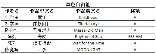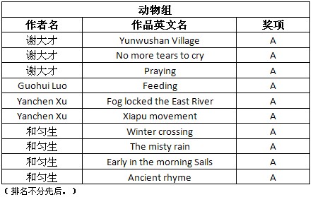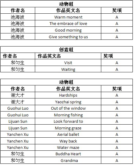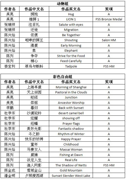 塞尔维亚第二届“动物”国际摄影展获奖成绩公布时间:2013年1月7日 来源:本站原创 塞尔维亚第二届“动物”国际摄影展(2nd INTERNATIONAL EXHIBITION OF PHOTOGRAPHY “ANIMALS”)近日公布结果。根据大赛总成绩统计,美国摄影学会(中国)(PSA China)会员有35幅作品获得入围以上奖项。其中,会员吴亮先生的作品《雄狮1》(LION 1)荣获动物组FSS铜奖。会员陈兴灿先生的作品《咆哮的狮王》(Shouting)荣获动物组沙龙绶带奖。会员娄宝利先生的作品《翠鸟与蝌蚪》(Tadpole)荣获动物组FSS绶带奖。会员陈列先生的作品《渔人网影》和《海韵》分别荣获彩色自由组和单色自由组FSS绶带奖。在此,向四位会员表示衷心的祝贺! 以下为入围获奖名单: (排名按姓氏笔画。A代表入围。FSS Bronze Medal代表FSS铜奖,Salon HM代表沙龙绶带奖,FSS HM代表FSS绶带奖。) 塞尔维亚第二届“动物”国际摄影展由美国摄影学会(PSA),国际影艺联盟(FIAP)、国际摄影家联盟(UPI)和塞尔维亚摄影学会(FSS)认证。所有PSA会员的入选作品将计入美国摄影学会(PSA)的“星标系统(PSA Star Ratings)”和“世界摄影名人录(Who’s Who in Photography)”。本届影展设立电子照片部(动物组、创意组、彩色自由和单色自由组)(EID),共四个小组别。以下为获奖作品和部分入围作品: 吴亮动物组FSS铜奖作品《雄狮1》 陈兴灿动物组沙龙绶带奖作品《咆哮的狮王》 娄宝利动物组FSS绶带奖作品《翠鸟与蝌蚪》 陈列彩色自由组FSS绶带奖作品《渔人网影》 陈列单色自由组FSS绶带奖作品《海韵》 张瑞祥动物组入围作品《迁徙》 李鹏彩色自由组入围作品《暮归》 杜学东彩色自由组入围作品《美妙光影》 陈金成彩色自由组入围作品《雪域金山》 潘金明彩色自由组入围作品《夕照瘦西湖》 陈竟辉单色自由组入围作品《月夜》 根据大赛公布的总成绩单,还有其他一些美国摄影学会(中国)PSA China会员和摄影朋友取得了不错的成绩,他们的入围信息如下: 在此,美国摄影学会(中国)(PSA China)向所有在本届影展中获得优异成绩的中国参展者表示衷心的祝贺!