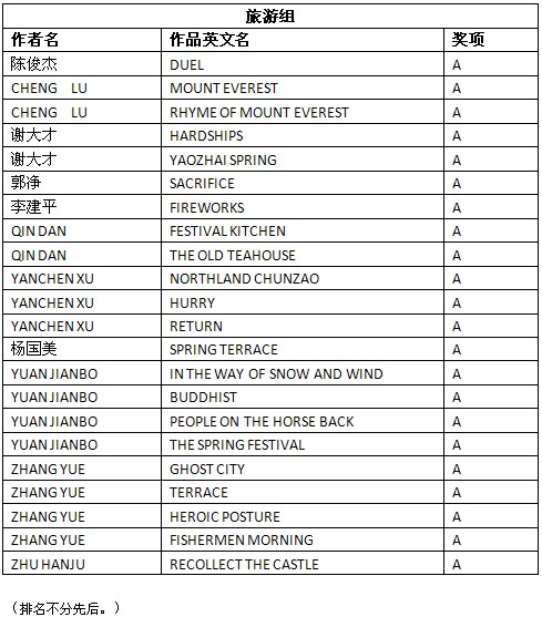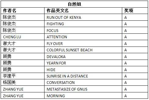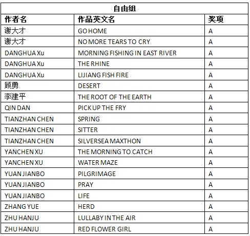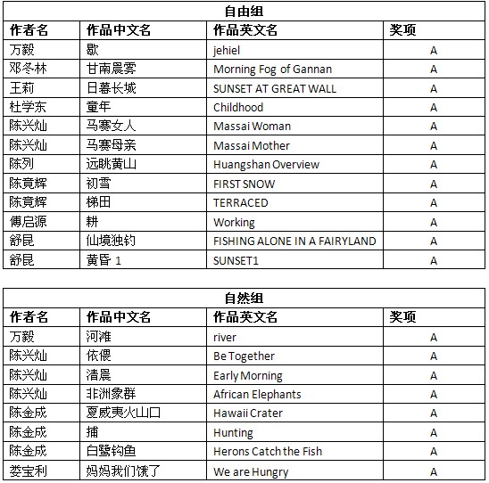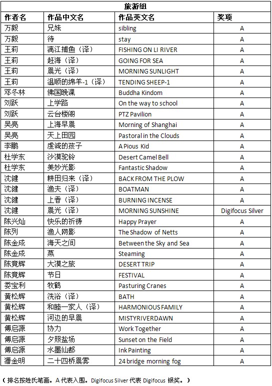 2012印度DIGIFOCUS第一届国际数码摄影展获奖成绩公布时间:2013年1月15日 来源:本站原创 2012印度DIGIFOCUS第一届国际数码摄影展(1st DIGIFOCUS INTERNATIONAL DIGITAL SALON 2012)近日公布结果。根据大赛总成绩统计,美国摄影学会(中国)(PSA China)会员有52幅作品获得入围以上奖项。其中,会员沈健先生的作品《晨光》(MORNING SUNSHINE)荣获旅游组Digifocus银奖。在此,向这位会员表示衷心的祝贺! 以下为入围获奖名单: 2012印度DIGIFOCUS第一届国际数码摄影展由美国摄影学会(PSA)、欧洲国际影艺联盟(FIAP)和印度摄影联盟(FIP)认证。所有PSA会员的入选作品将计入美国摄影学会(PSA)的“星标系统(PSA Star Ratings)”和“世界摄影名人录(Who’s Who in Photography)”。本届影展设立电子照片部(自由组)(EID)、自然部(自由组)和旅游摄影部(自由组)共三个小组别。以下为获奖作品和部分入围作品: 沈健旅游组Digifocus银奖《晨光》 万毅自然组入围作品《河滩》 邓冬林自由组入围作品《甘南晨雾》 王莉旅游组入围作品《温顺的绵羊-1》 杜学东自由组入围作品《童年》 陈兴灿自由组入围作品《马赛母亲》 陈列自由组入围作品《远眺黄山》 陈竟辉自由组入围作品《初雪》 傅启源自由组入围作品《耕》 舒昆自由组入围作品《黄昏1》 陈金成自然组入围作品《捕》 娄宝利自然组入围作品《妈妈我们饿了》 刘跃旅游组入围作品《云台阁楼》 吴亮旅游组入围作品《天上田园》 李鹏旅游组入围作品《虔诚的孩子》 黄松辉旅游组入围作品《和睦一家人》 潘金明旅游组入围作品《二十四桥晨雾》 根据大赛公布的总成绩单,还有其他一些美国摄影学会(中国)PSA China会员和摄影朋友取得了不错的成绩,他们的入围信息如下: 在此,美国摄影学会(中国)(PSA China)向所有在本届影展中获得优异成绩的中国参展者表示衷心的祝贺!