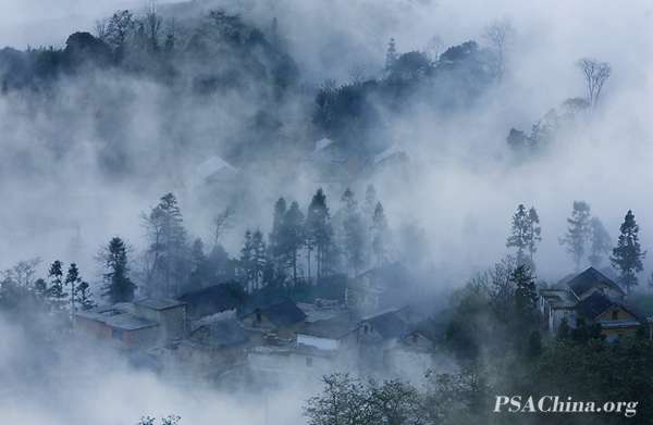 晨雾飘绕古村落 |