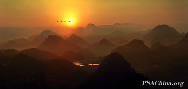 甘永安画意组日出与日落主题(彩色)作品:《万峰岭日出》Wan Feng Ling sunrise