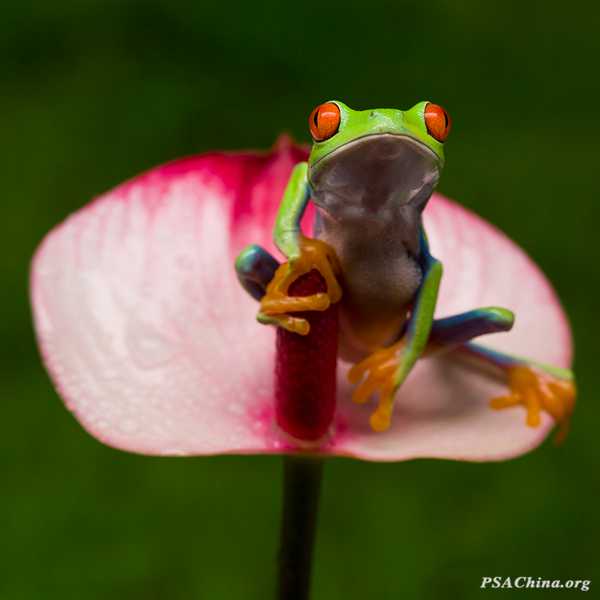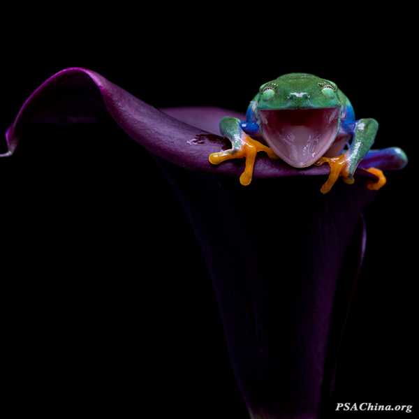 吴亮作品:《树蛙与花3》Tree frog and flowers3荣获画意彩色组微距主题PSA 荣誉奖!