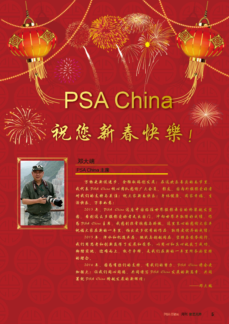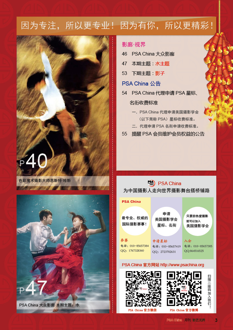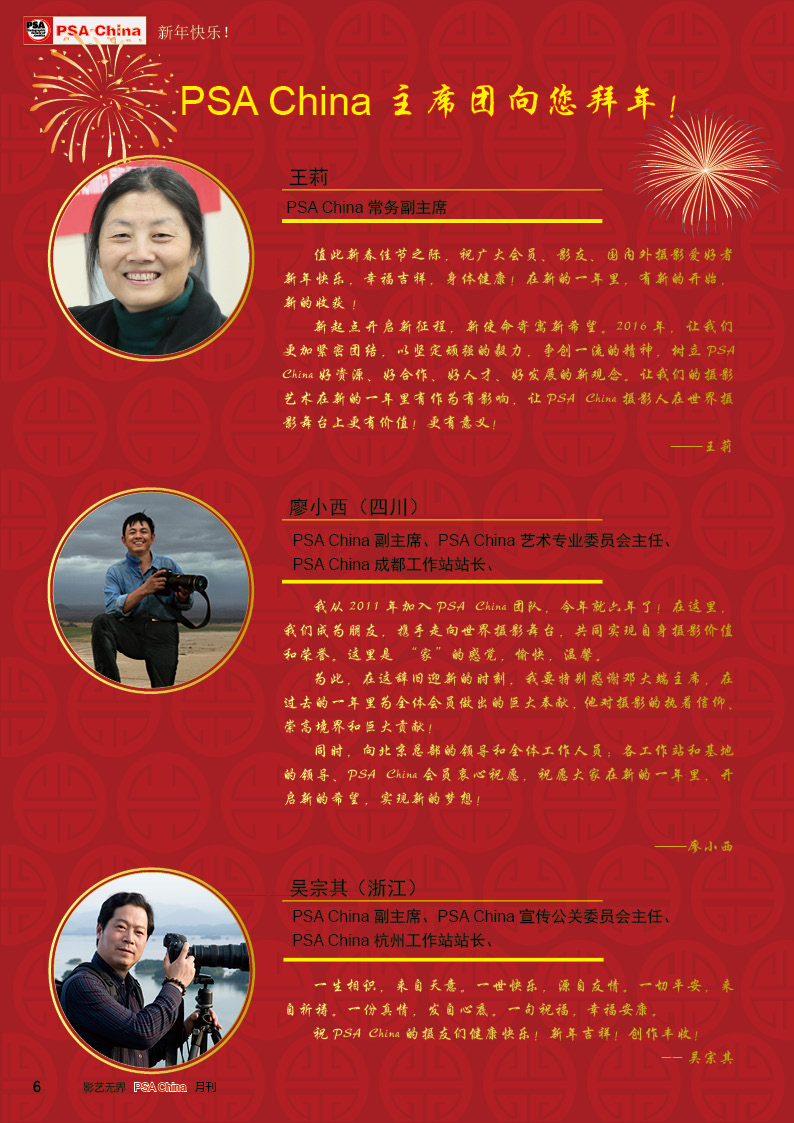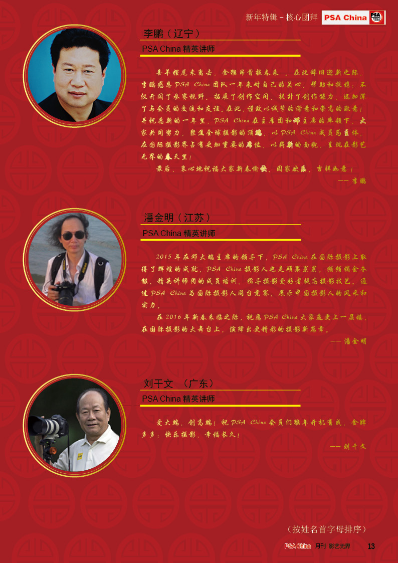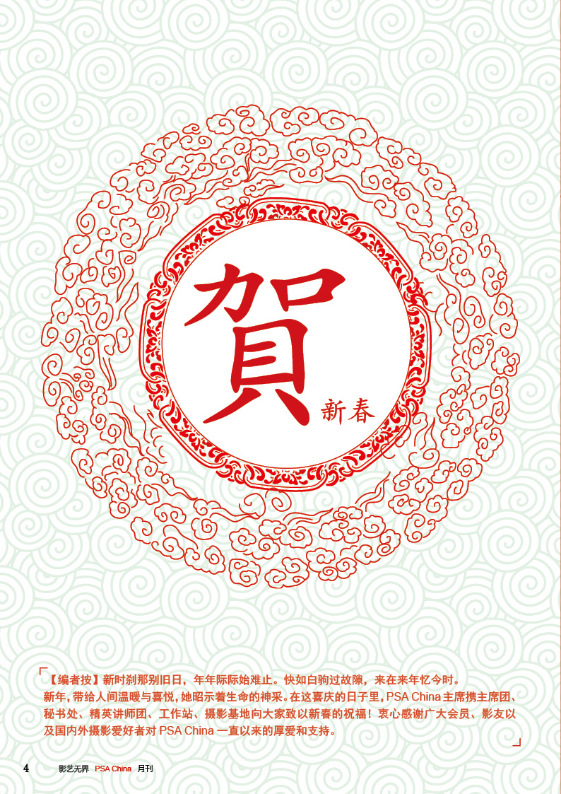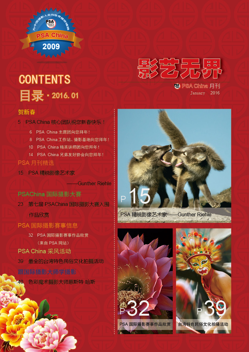 《影艺无界》2016-1月刊(总第13期)PSA China核心团队新春特辑—恭贺新春。PSA月刊精选为您推荐PSA精锐影像艺术家——Gunther Riehle热爱摄影保护自然的摄影之路。跟国际摄影大师学摄影为您带来了色彩魔术摄影大师恩斯特·哈斯的精彩作品。 本期月刊大量精美摄影作品以飨读者,其中有第七届PSAChina国际摄影大赛入围作品;有PSA网站的精选作品欣赏;PSA China大众影廊水主题作品。