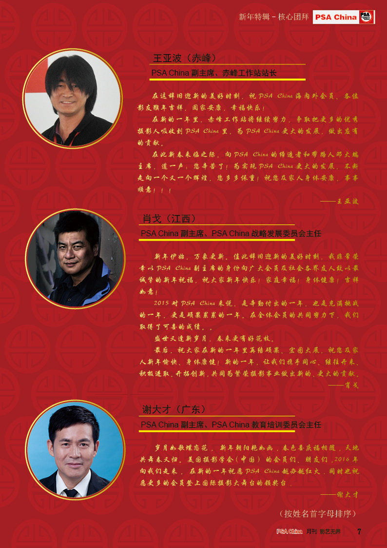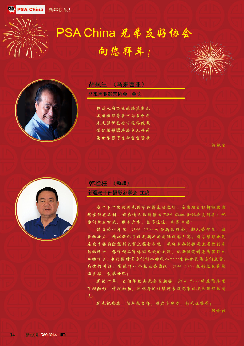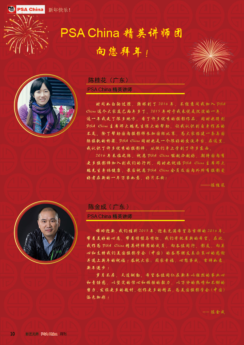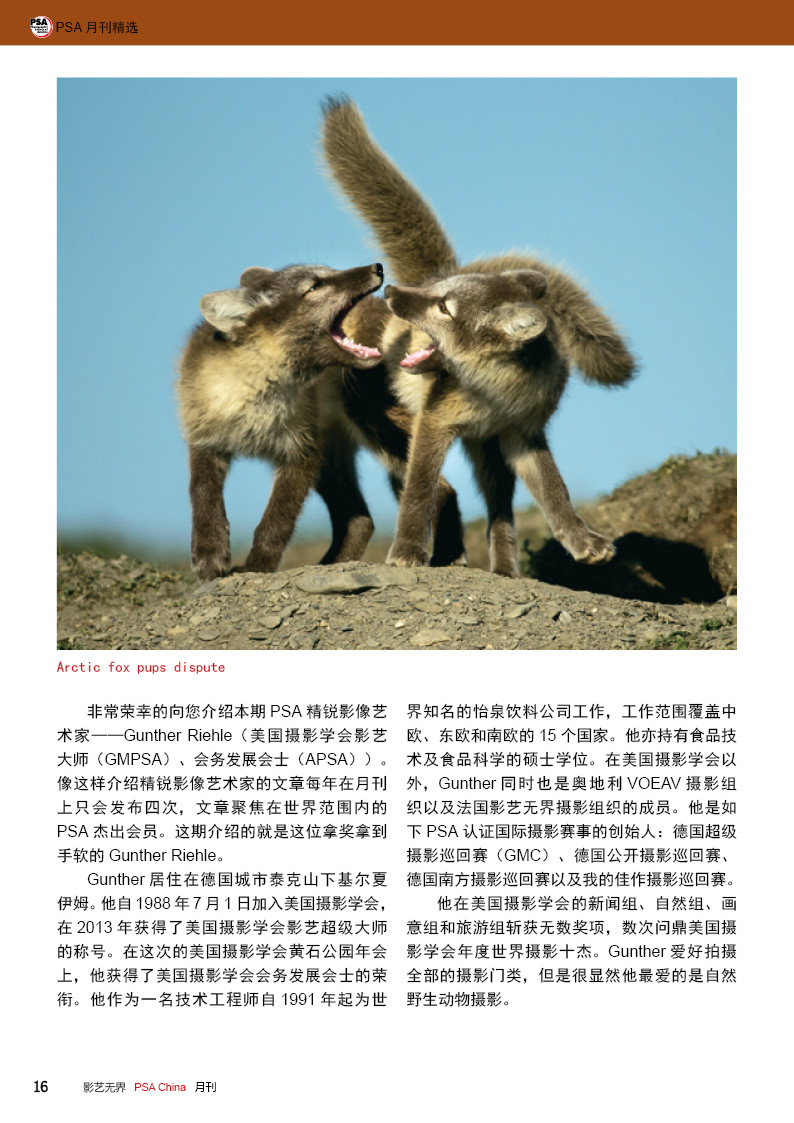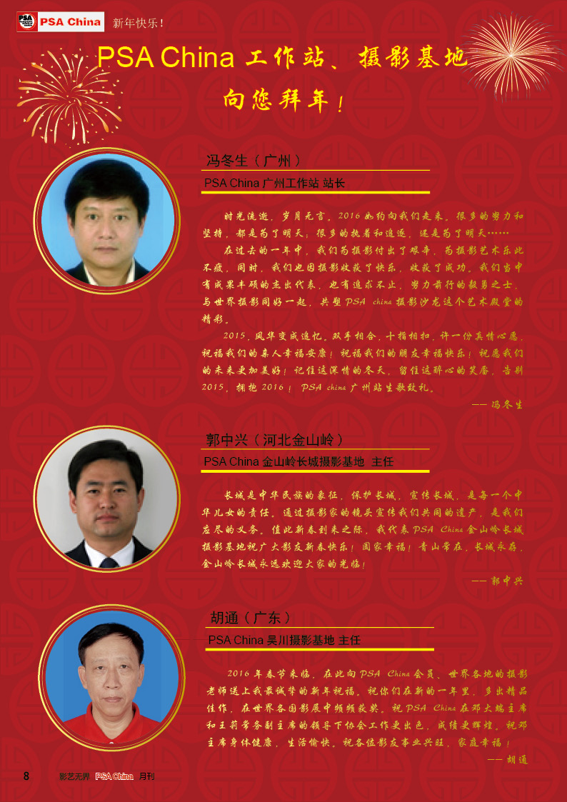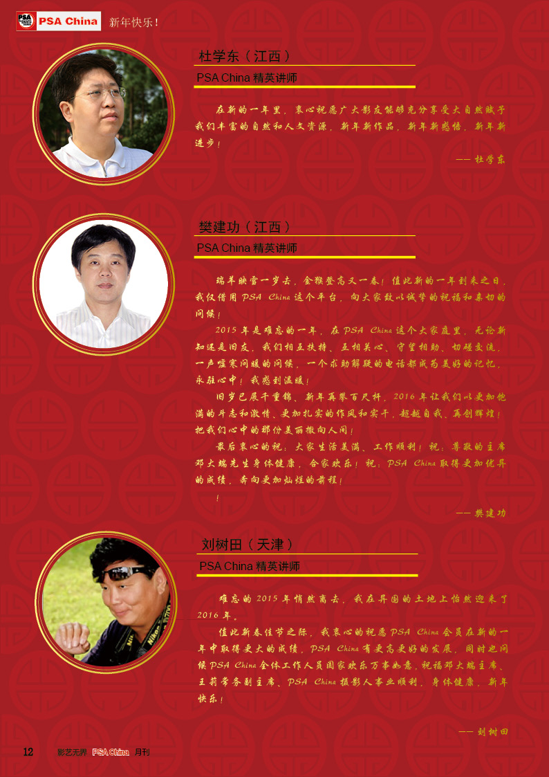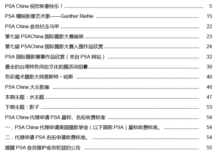 《影艺无界》2016-1月刊(总第13期)PSA China核心团队新春特辑—恭贺新春。PSA月刊精选为您推荐PSA精锐影像艺术家——Gunther Riehle热爱摄影保护自然的摄影之路。跟国际摄影大师学摄影为您带来了色彩魔术摄影大师恩斯特·哈斯的精彩作品。 本期月刊大量精美摄影作品以飨读者,其中有第七届PSAChina国际摄影大赛入围作品;有PSA网站的精选作品欣赏;PSA China大众影廊水主题作品。