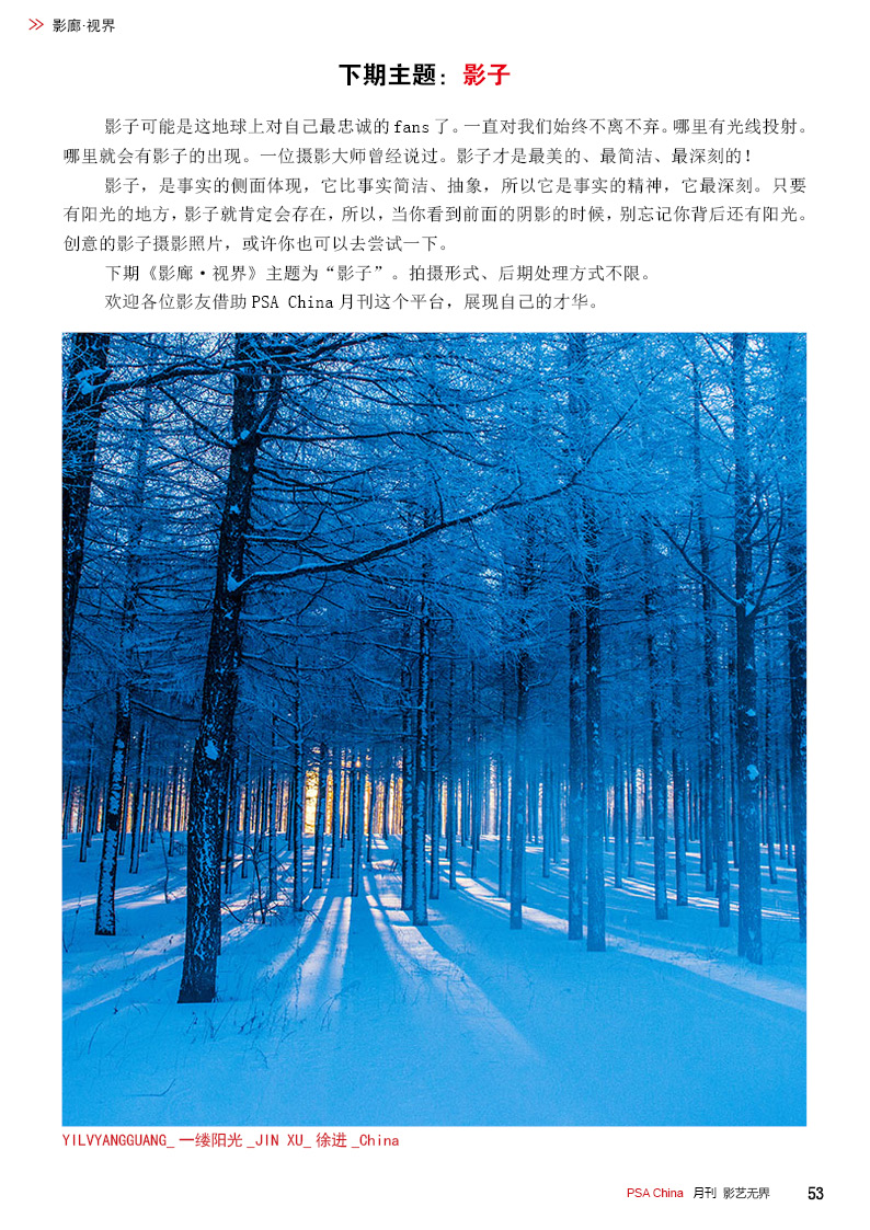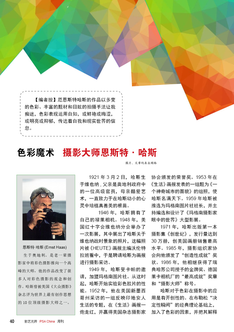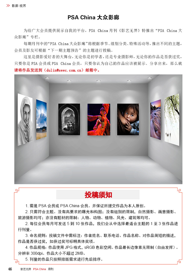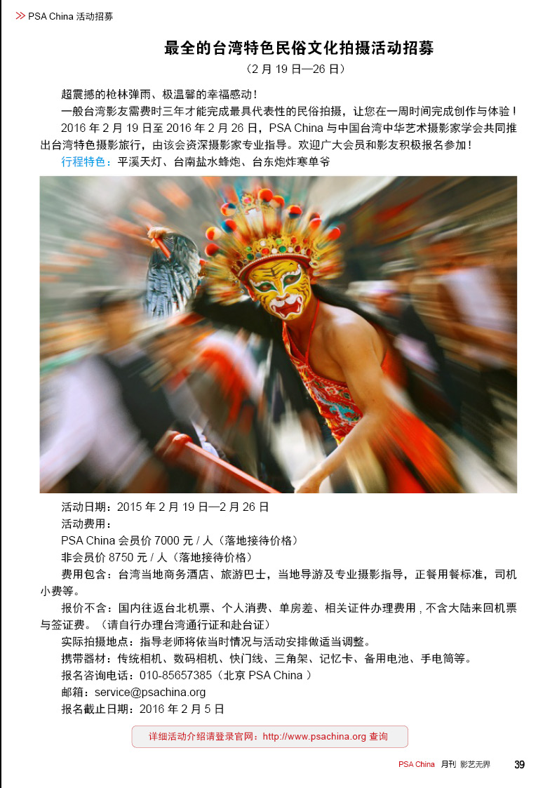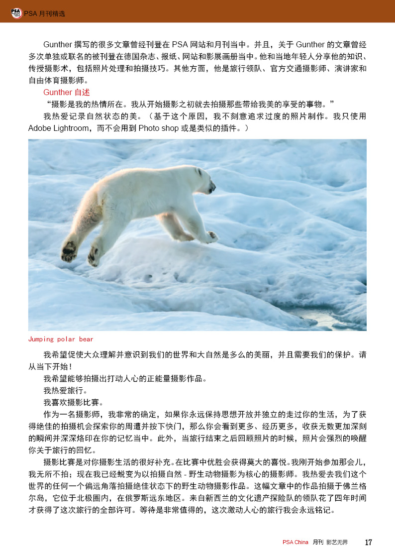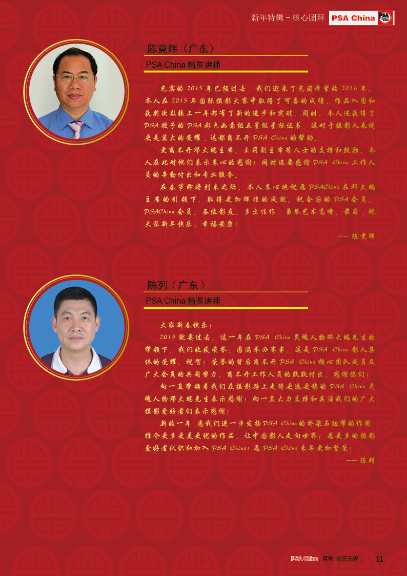 《影艺无界》2016-1月刊(总第13期)PSA China核心团队新春特辑—恭贺新春。PSA月刊精选为您推荐PSA精锐影像艺术家——Gunther Riehle热爱摄影保护自然的摄影之路。跟国际摄影大师学摄影为您带来了色彩魔术摄影大师恩斯特·哈斯的精彩作品。 本期月刊大量精美摄影作品以飨读者,其中有第七届PSAChina国际摄影大赛入围作品;有PSA网站的精选作品欣赏;PSA China大众影廊水主题作品。