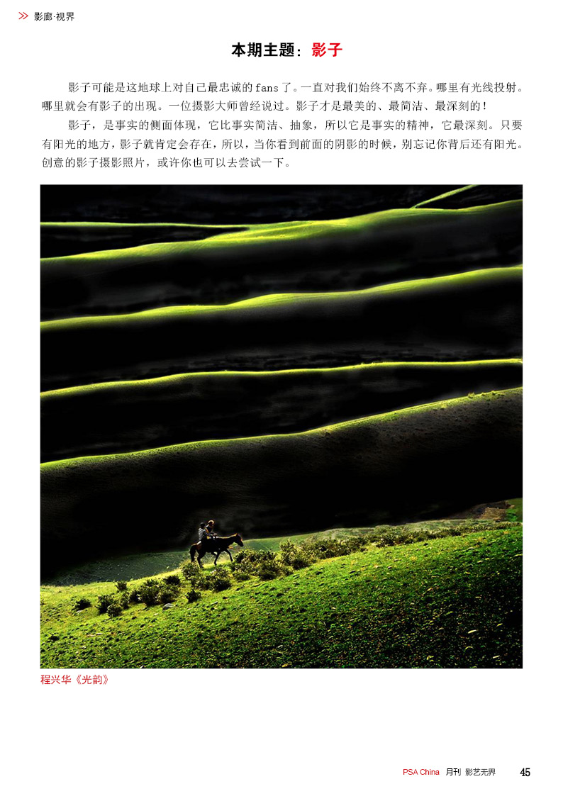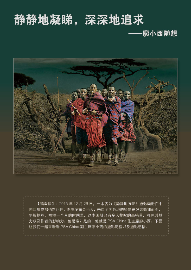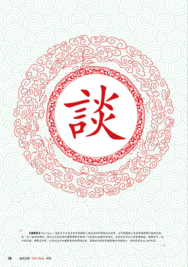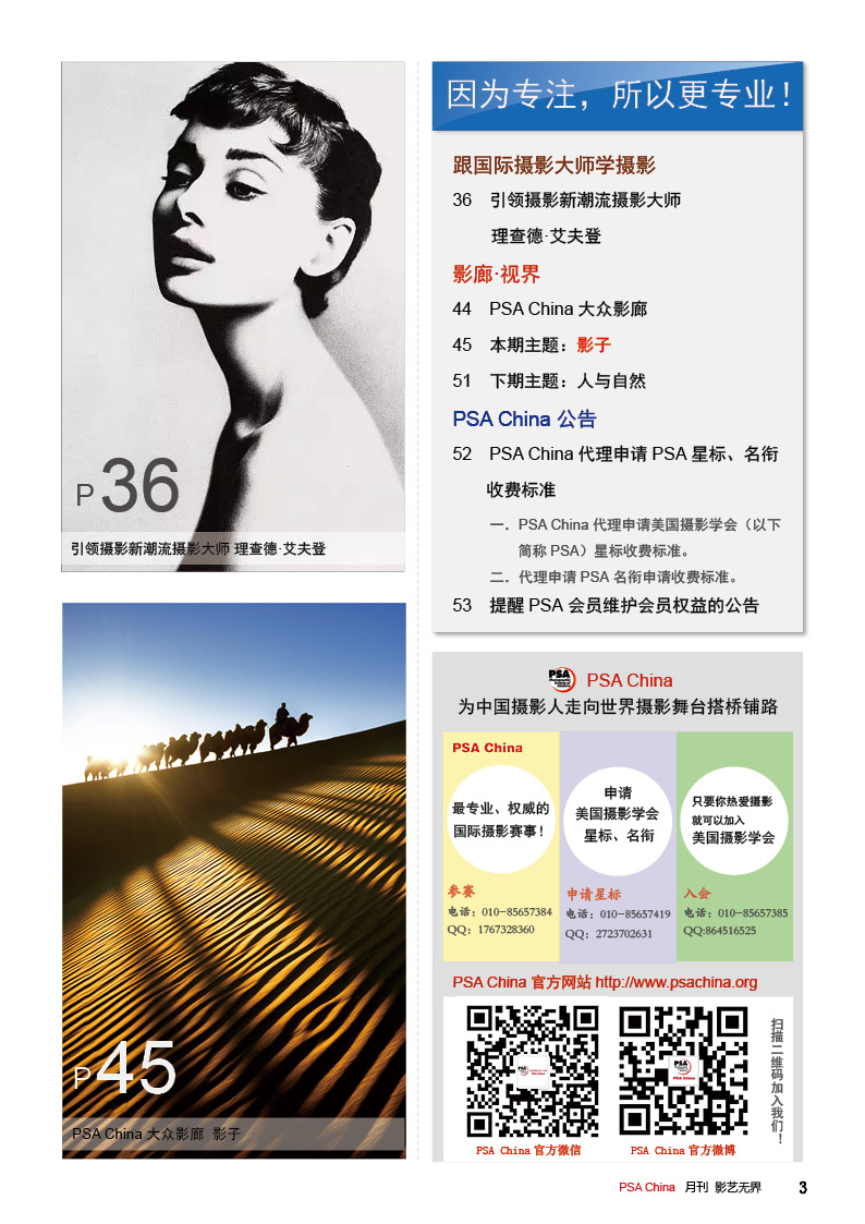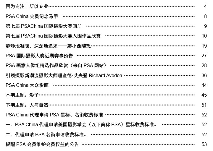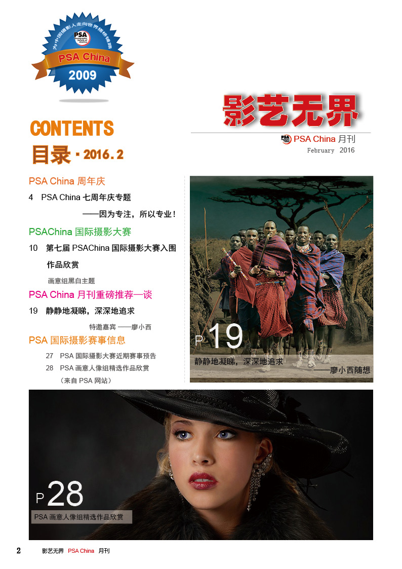 《影艺无界》2016-2月刊(总第14期)PSA China成立七周年庆专题——因为专注,所以专业!本期月刊让我们一起回顾PSA China成立七周年。本期月刊“谈”栏目,特邀请PSA China副主席廖小西跟大家聊聊他的摄影之路。 本期月刊大量精美摄影作品以飨读者,其中有PSA网站的画意人像组精选作品欣赏;也有引领摄影新潮流摄影大师理查德·艾夫登的作品;PSA China大众影廊影子主题作品。