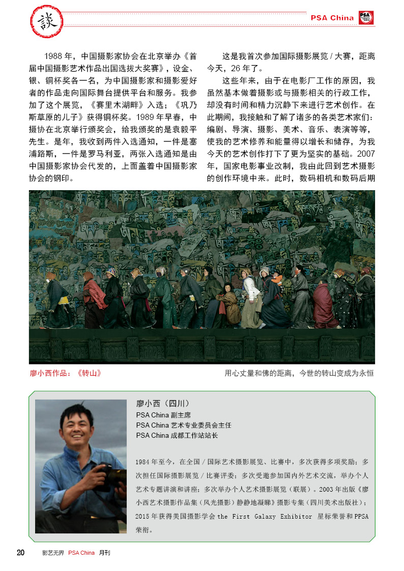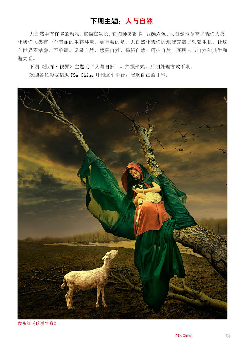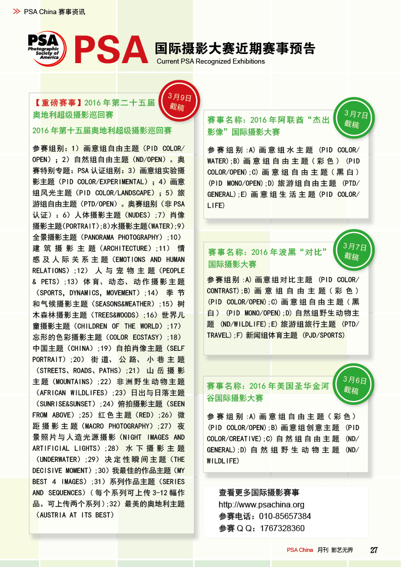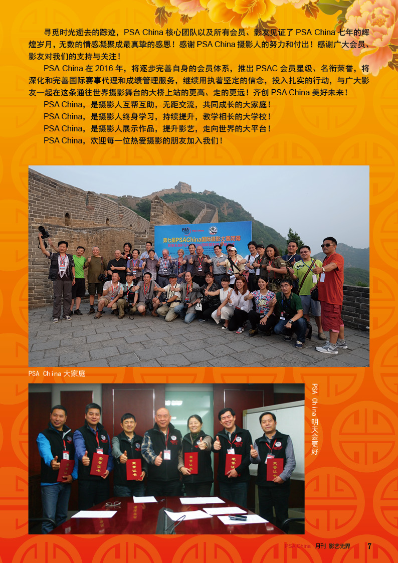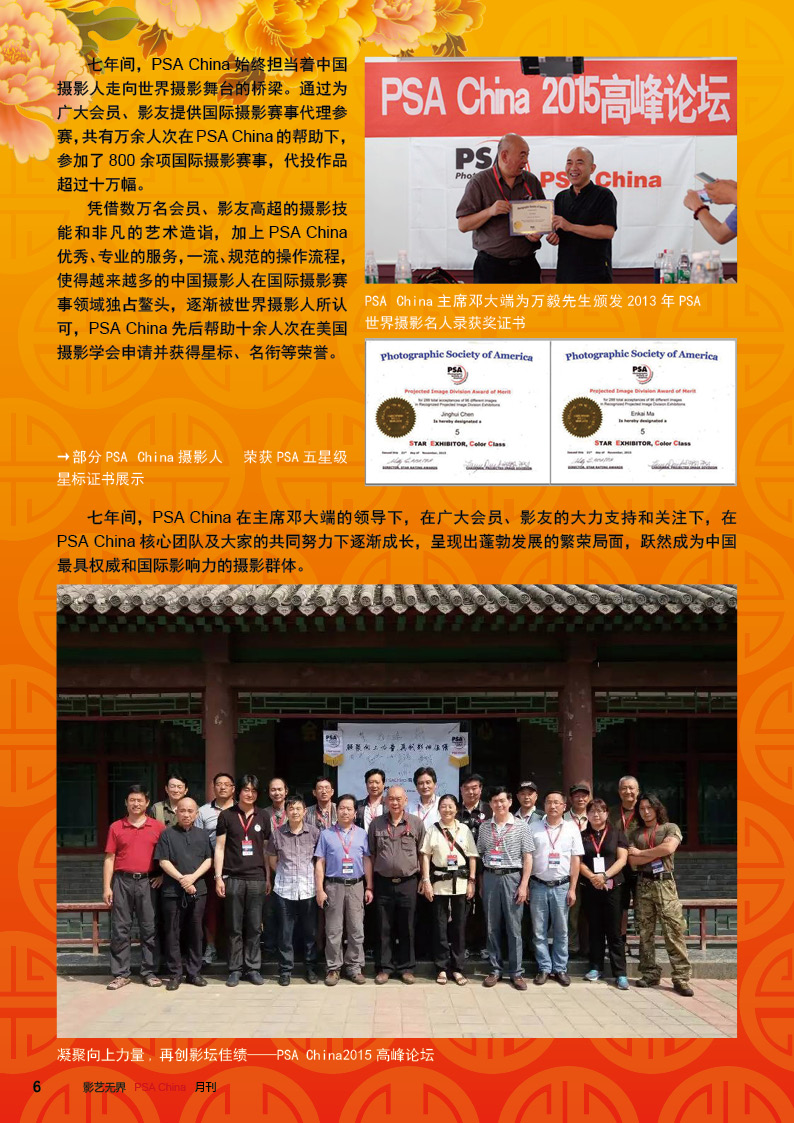 《影艺无界》2016-2月刊(总第14期)PSA China成立七周年庆专题——因为专注,所以专业!本期月刊让我们一起回顾PSA China成立七周年。本期月刊“谈”栏目,特邀请PSA China副主席廖小西跟大家聊聊他的摄影之路。 本期月刊大量精美摄影作品以飨读者,其中有PSA网站的画意人像组精选作品欣赏;也有引领摄影新潮流摄影大师理查德·艾夫登的作品;PSA China大众影廊影子主题作品。