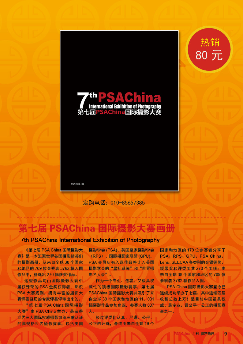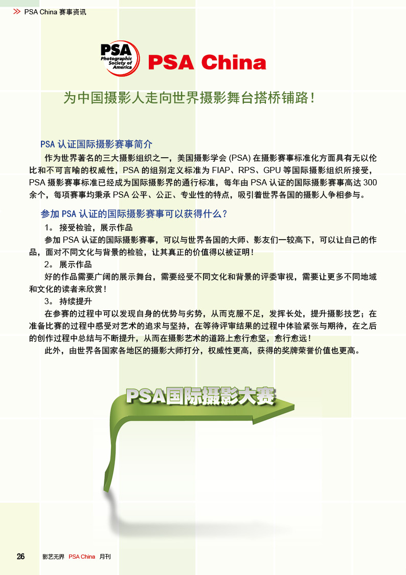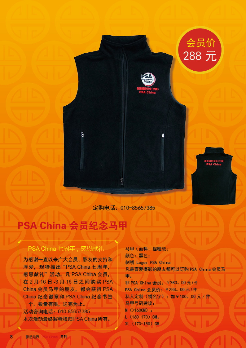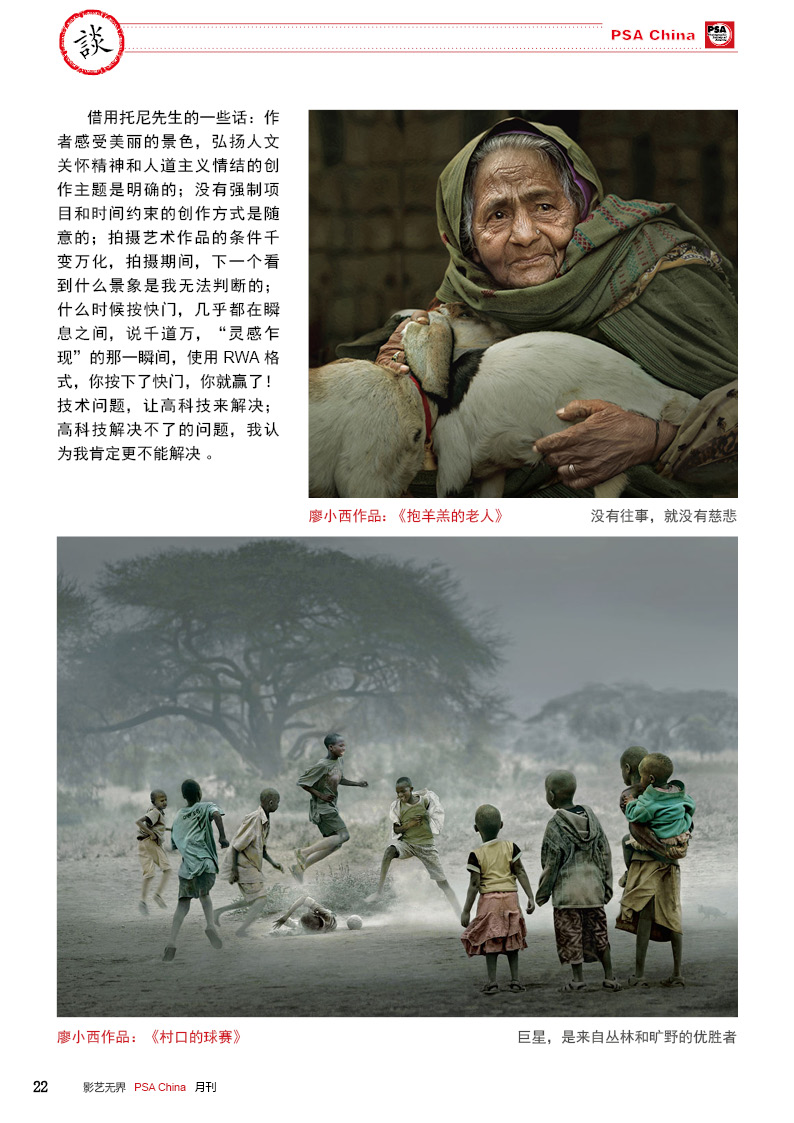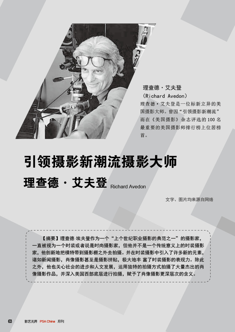 《影艺无界》2016-2月刊(总第14期)PSA China成立七周年庆专题——因为专注,所以专业!本期月刊让我们一起回顾PSA China成立七周年。本期月刊“谈”栏目,特邀请PSA China副主席廖小西跟大家聊聊他的摄影之路。 本期月刊大量精美摄影作品以飨读者,其中有PSA网站的画意人像组精选作品欣赏;也有引领摄影新潮流摄影大师理查德·艾夫登的作品;PSA China大众影廊影子主题作品。