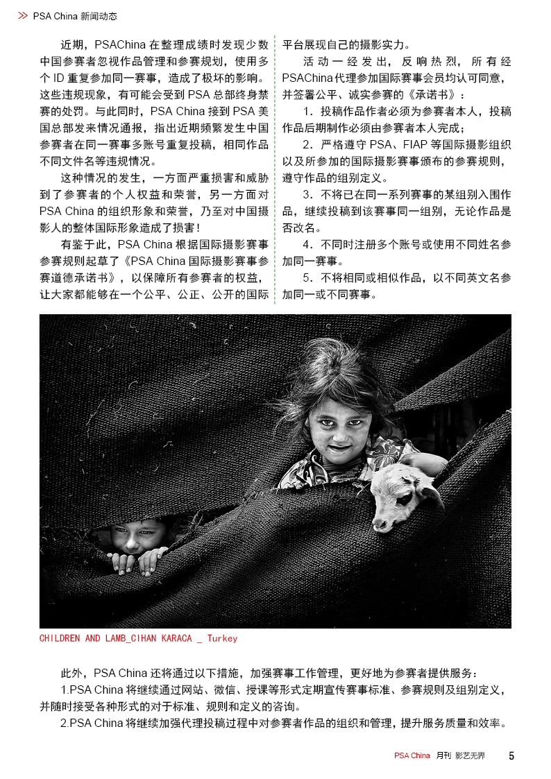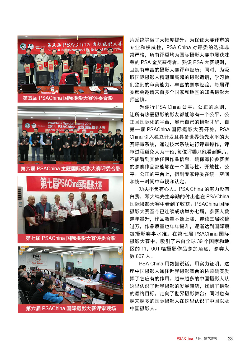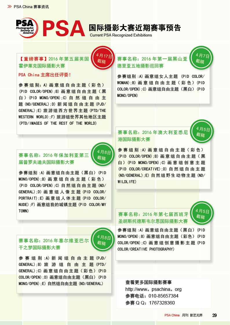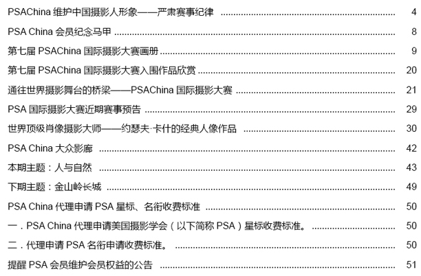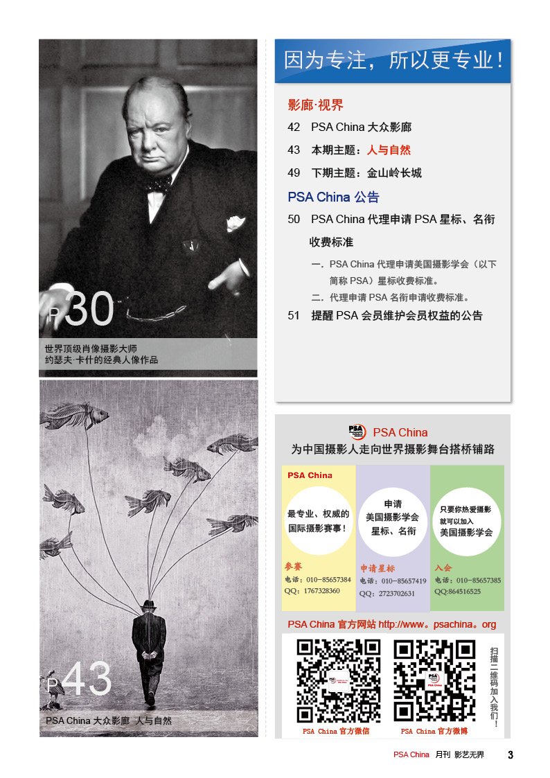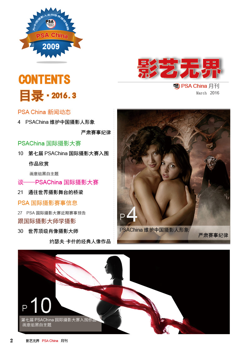 《影艺无界》2016-3月刊(总第15期)使用多个ID重复参加同一赛事,属于违规现象,有可能会受到PSA总部终身禁赛的处罚。本期月刊重点重申国际摄影赛事纪律问题。 通往世界摄影舞台的桥梁向您讲讲PSAChina国际摄影大赛的发展;此外还有大量国内外摄影作品欣赏:第七届PSAChina国际摄影大赛画意女性主题入围作品欣赏,世界顶级肖像摄影大师 约瑟夫·卡什的经典人像作品;PSA China大众影廊主题:人与自然。