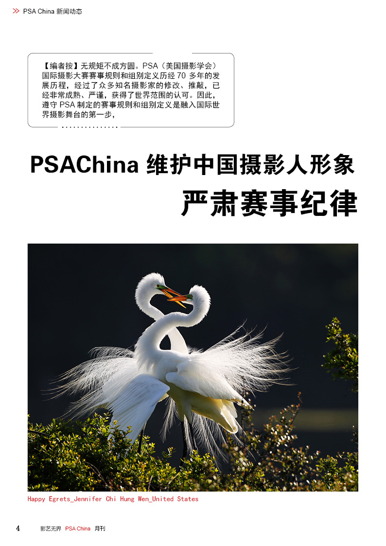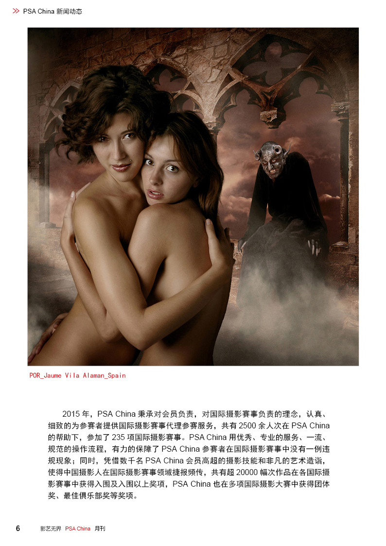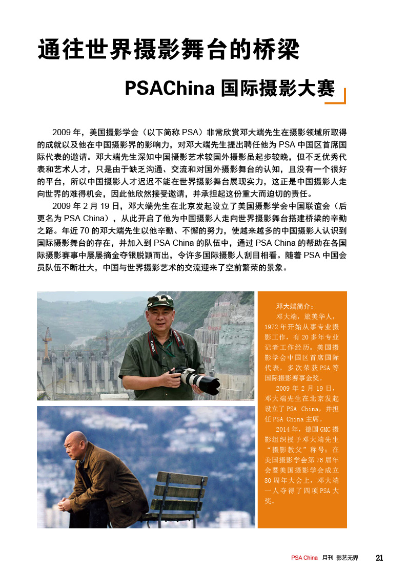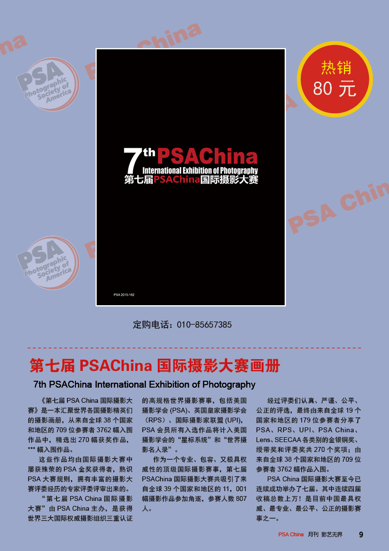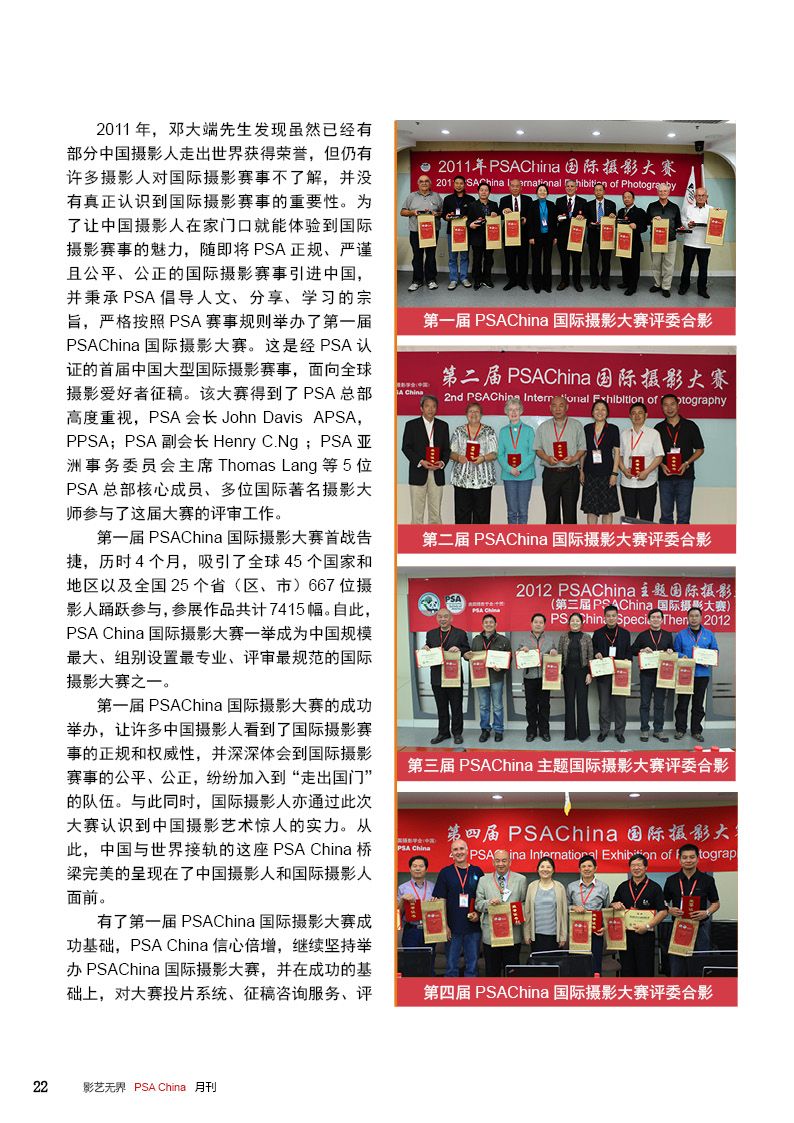 《影艺无界》2016-3月刊(总第15期)使用多个ID重复参加同一赛事,属于违规现象,有可能会受到PSA总部终身禁赛的处罚。本期月刊重点重申国际摄影赛事纪律问题。 通往世界摄影舞台的桥梁向您讲讲PSAChina国际摄影大赛的发展;此外还有大量国内外摄影作品欣赏:第七届PSAChina国际摄影大赛画意女性主题入围作品欣赏,世界顶级肖像摄影大师 约瑟夫·卡什的经典人像作品;PSA China大众影廊主题:人与自然。